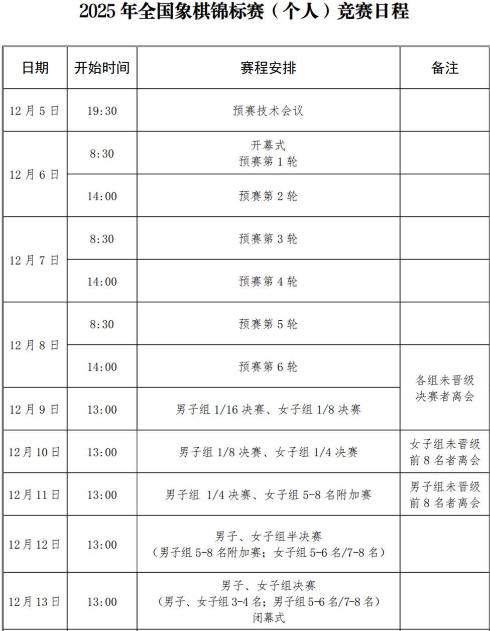 大賽的戰程非常寬設,12月6-8日,每天上午八點半、下午兩點,各一輪預賽;12月9日至13日,每天下午一點,進行一輪淘汰賽,直至決出總冠軍,淘汰戰一天一場,利於棋手發揮。