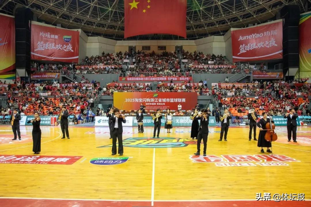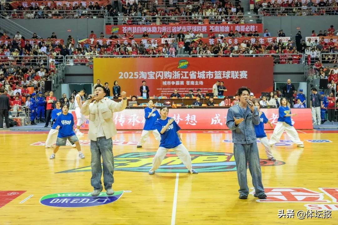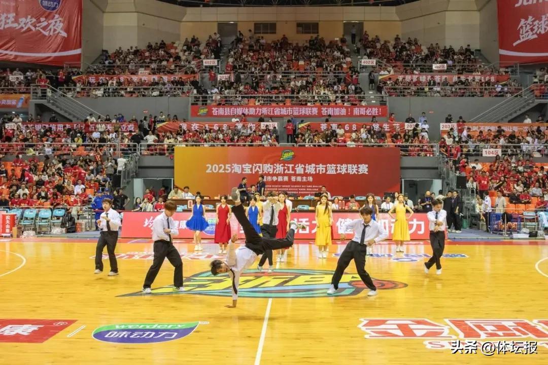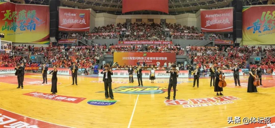 中場時分,演出再掀高潮。管絃合奏《鋼鐵洪流進行曲》融合小提琴、大提琴、小號、長號、圓號等多種器樂,以每分鐘88拍的激昂節奏奏響排山倒海之勢,完美契合體育競技的奮進拼搏精神。隨後,舞蹈《Another Day of Sun》以色彩亮麗的演出服裝、豐富多元的現代舞種、富有衝擊力的隊形變換,推動“青春活力”與“體育精神”深度融合,讓全場熱血沸騰。壓軸登場的主題歌曲《籃耀蒼南》更是唱響“文化+體育”最強音,旋律青春歡快,歌詞展現蒼南地域文化、拼搏精神及籃球元素,表演配合舞蹈和主場啦啦隊,將館內氣氛推向頂點。