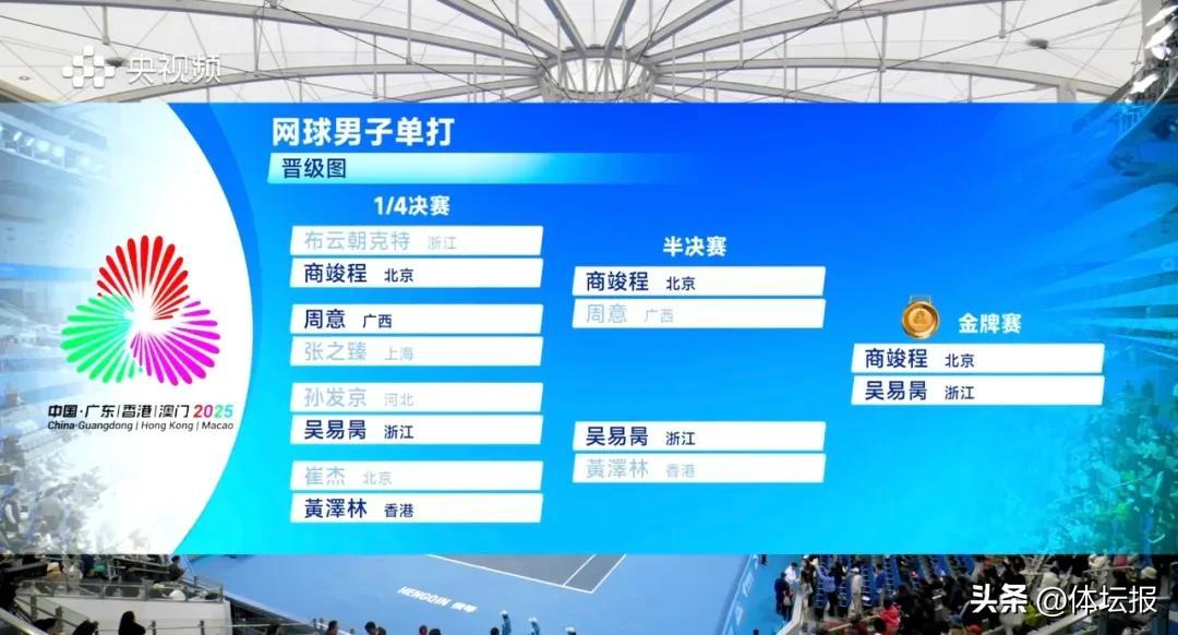 11月19日,第十五屆全運會網球項目男子單打進入半決賽日,浙江選手吳易昺在首盤搶七惜敗的情況下,第二盤守住搶七,最終三盤取勝,苦戰近三小時,6-7(6)/7-6(7)/6-4逆轉老對手黃澤林,取得交手首勝的同時,三戰全運會首進男單金牌賽!