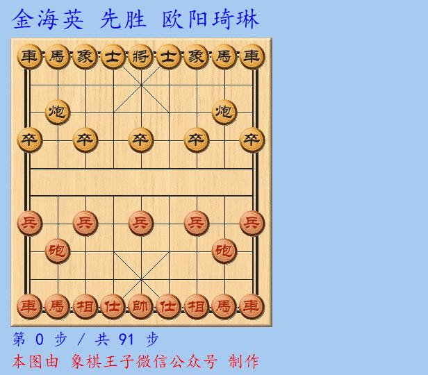 這盤棋,金海英執紅棋先手,佈下飛相陣,歐陽琦琳來勢剛猛,應以跳右馬轉左中炮。