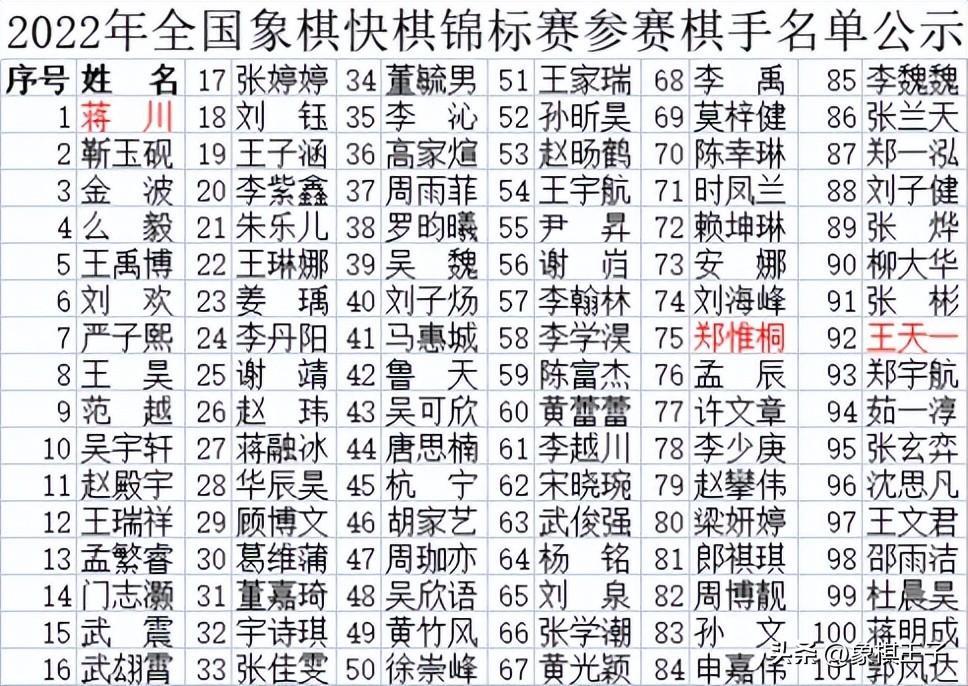 當前,儘管暫緩舉行,但賽事的報名已截止,根據組委會的2022年全國象棋快棋錦標賽參賽棋手名單公示。
