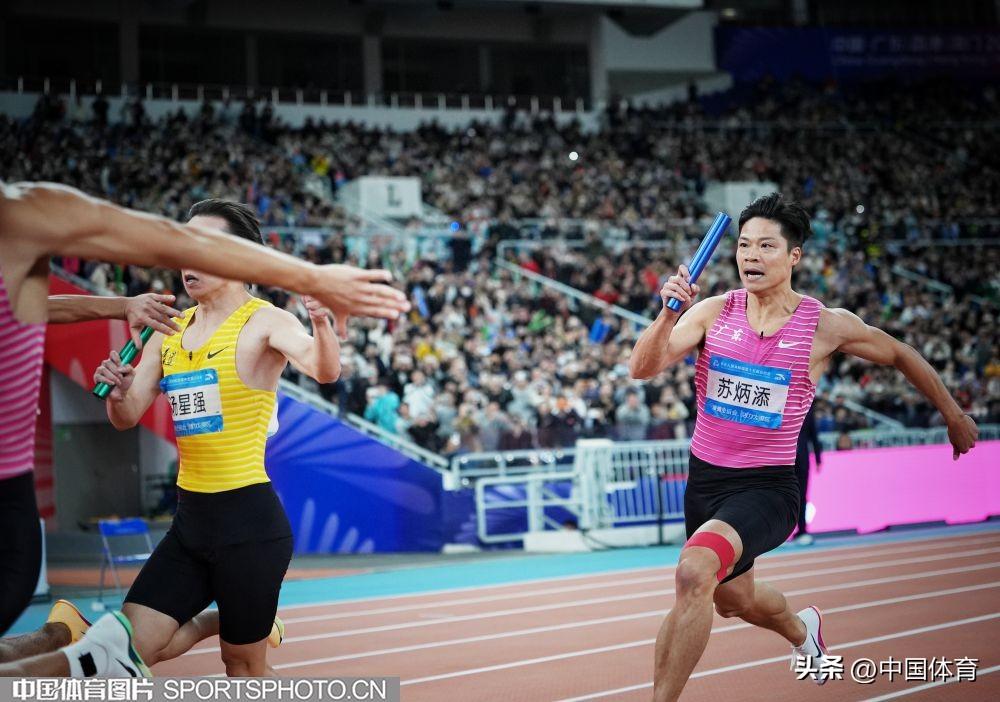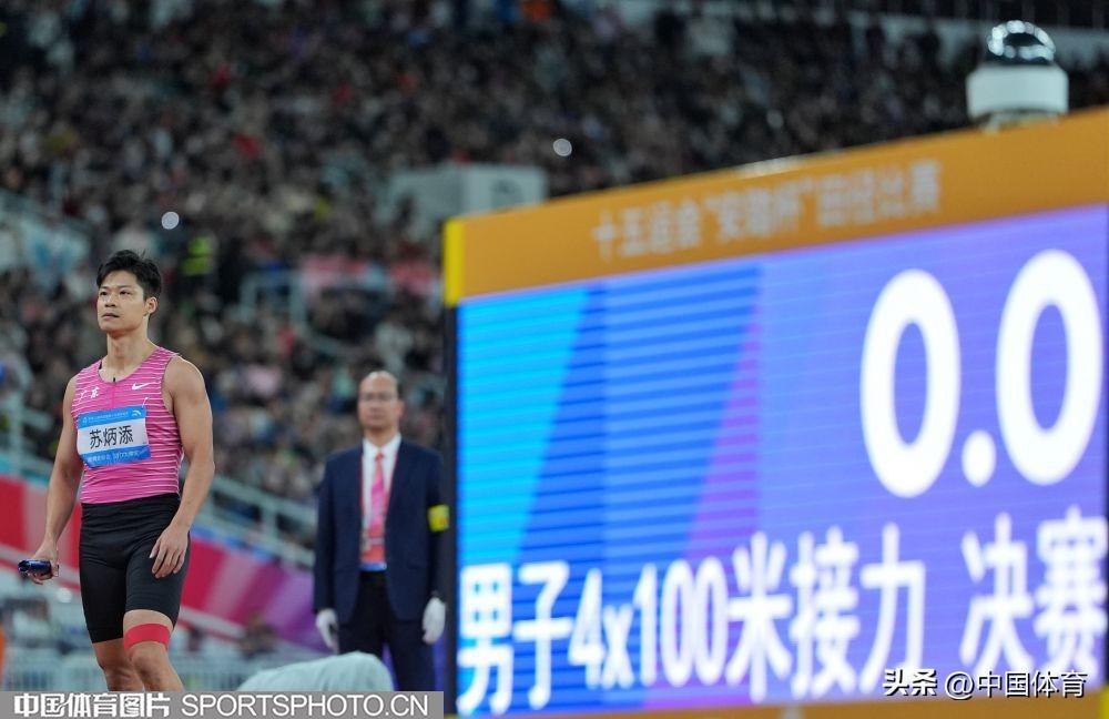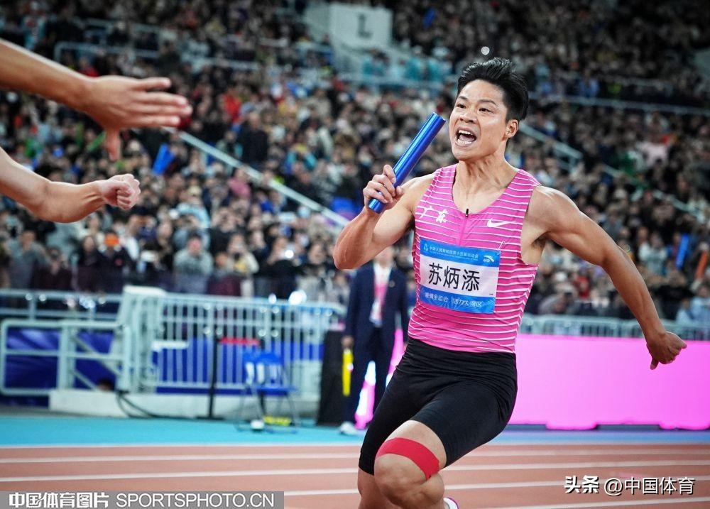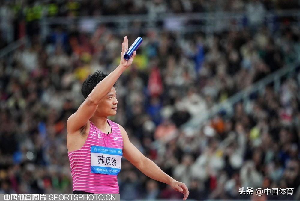中國體育訊 11月20日晚,第十五屆全國運動會田徑男子4x100米接力決賽在廣東省奧體中心體育場舉行。由蘇炳添領銜的廣東隊以38秒71的成績獲得第四名。這場比賽也是“亞洲飛人”蘇炳添的職業生涯最後一戰。賽後,他繞場一週致意,全場觀衆起立,爲這名短跑名將送上賽場告別的祝福。(中國體育圖片 魏徵 張昕 攝)
