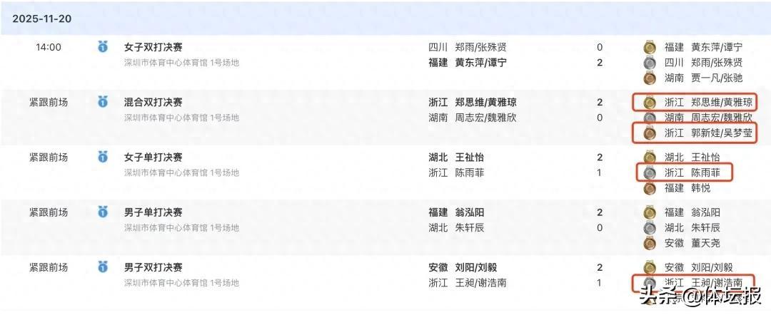其中浙江隊的鄭思維/黃雅瓊和郭新娃/吳夢瑩分別獲得混雙的金牌和銅牌,陳雨菲獲得女單銀牌,王昶/謝浩南獲得男雙銀牌。