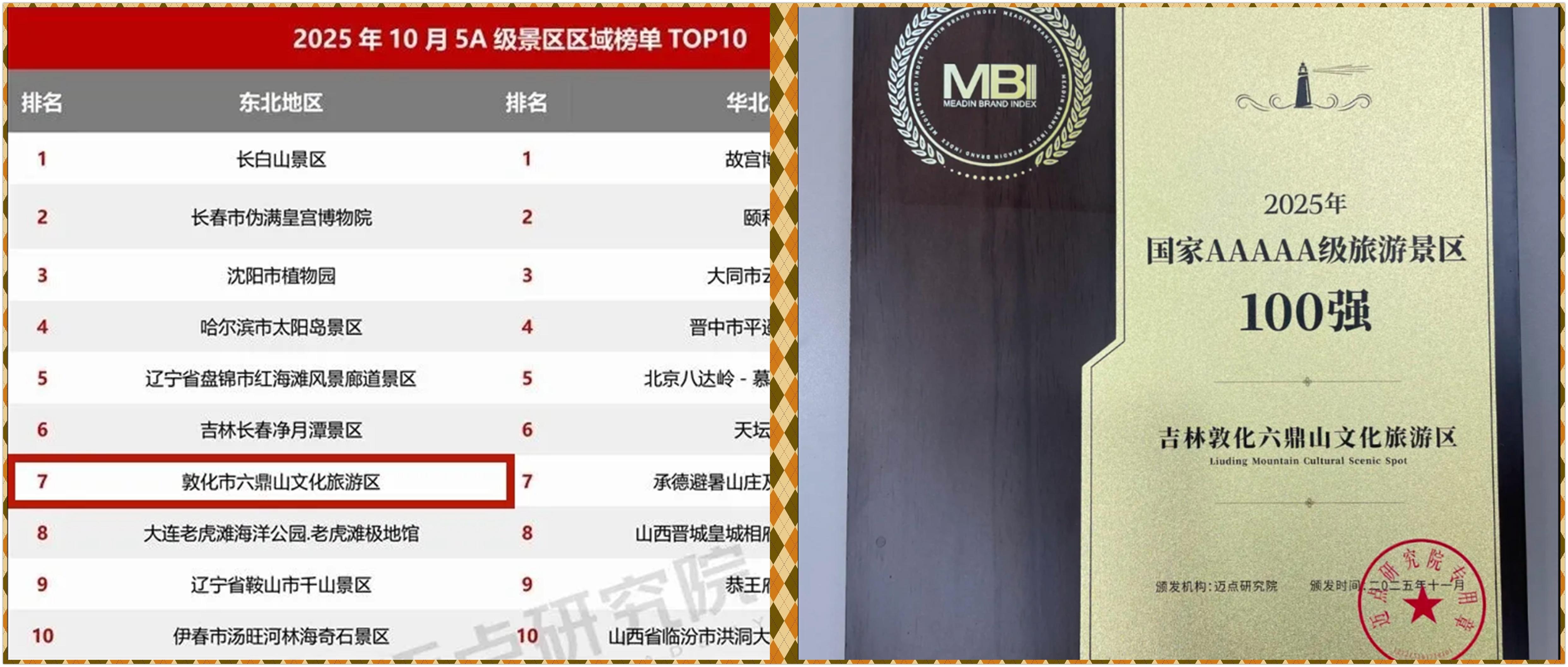 在剛剛發佈的2025年10月5A級景區區域榜單T0P10中,敦化市六鼎山文化旅遊區排列東北地區第七位,也登上全國景區的100強榜單,成爲東北的標誌性景點和麪向全國的旅遊好地方。