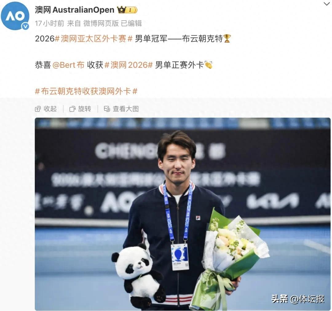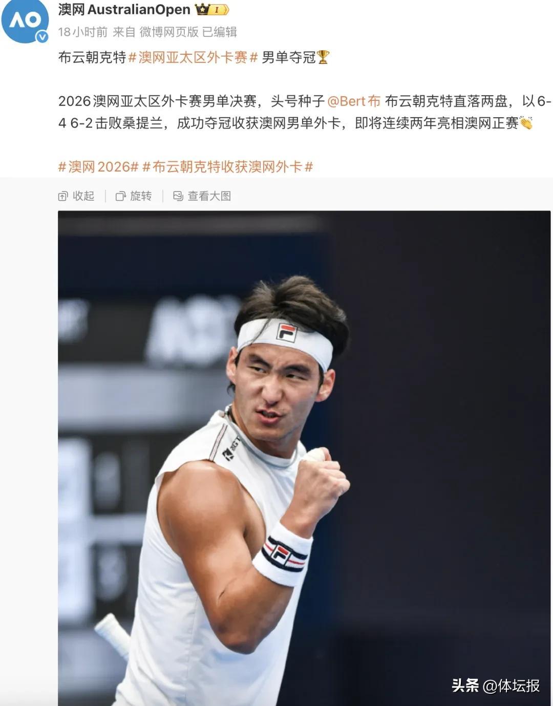 11月29日,2026澳大利亞網球公開賽亞太區外卡賽男子單打決賽在四川省成都市舉行。中國選手布雲朝克特2比0戰勝日本選手桑提蘭·阿克拉,奪得冠軍,並獲得2026澳大利亞網球公開賽男單外卡,即將連續兩年亮相澳網正賽。