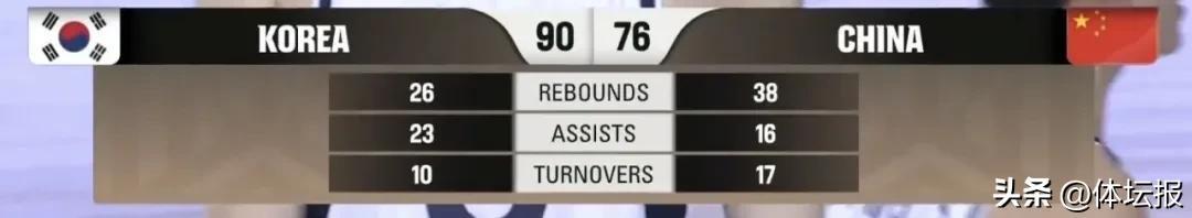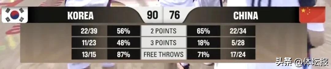 此役,中國男籃三人得分上雙,程帥澎拿下19分並命中4記三分,胡金秋貢獻18分,周琦得到17分15籃板;韓國隊四人得分上雙,李政玹砍下全場最高的24分並投進6記三分,李賢重得到20分。