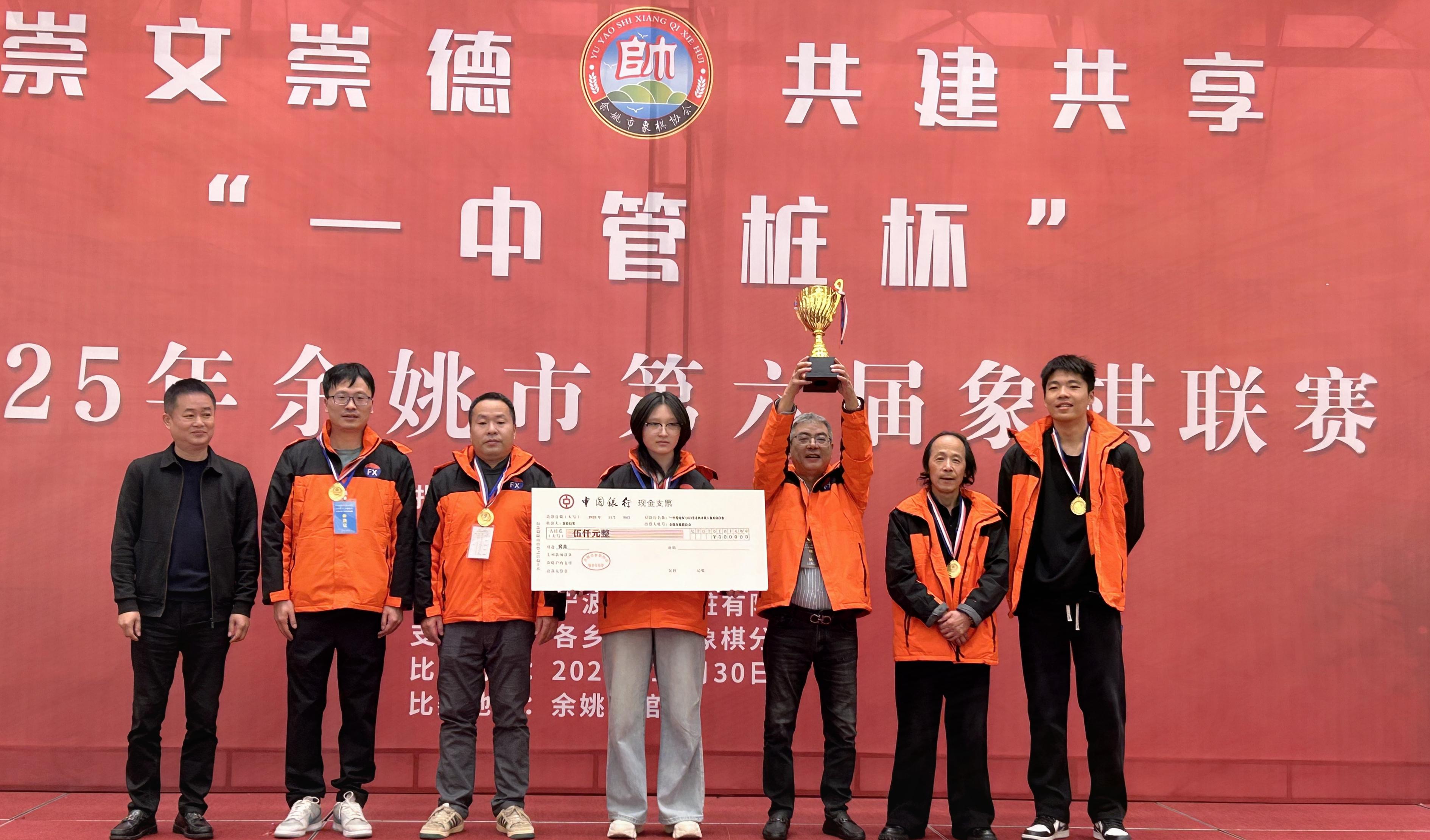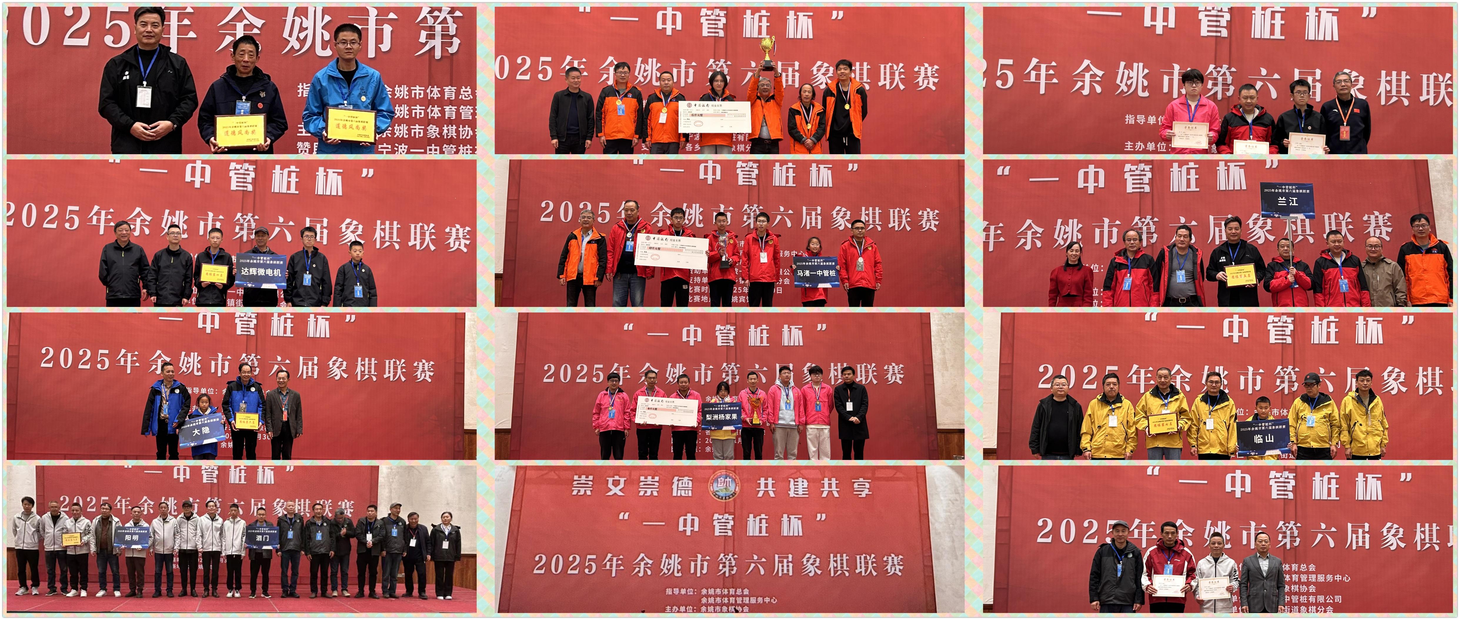 熱烈祝賀2025年“一中管樁杯”餘姚市第六屆象棋聯賽取得圓滿成功,賀喜王海潮先生率領三七市福欣隊勇奪總冠軍,恭喜邱東、虞偉龍、錢俊懿、施建波、朱蘭婷等冠軍成員,恭祝馬渚一中管樁隊、梨洲街道楊家果隊、達輝微電機隊、蘭江街道隊等優秀獲獎隊伍和棋手,祝福餘姚象棋和餘姚聯賽越來越好,芝麻開花節節高,更上一層樓!