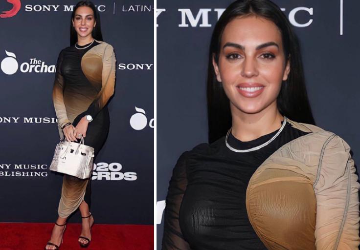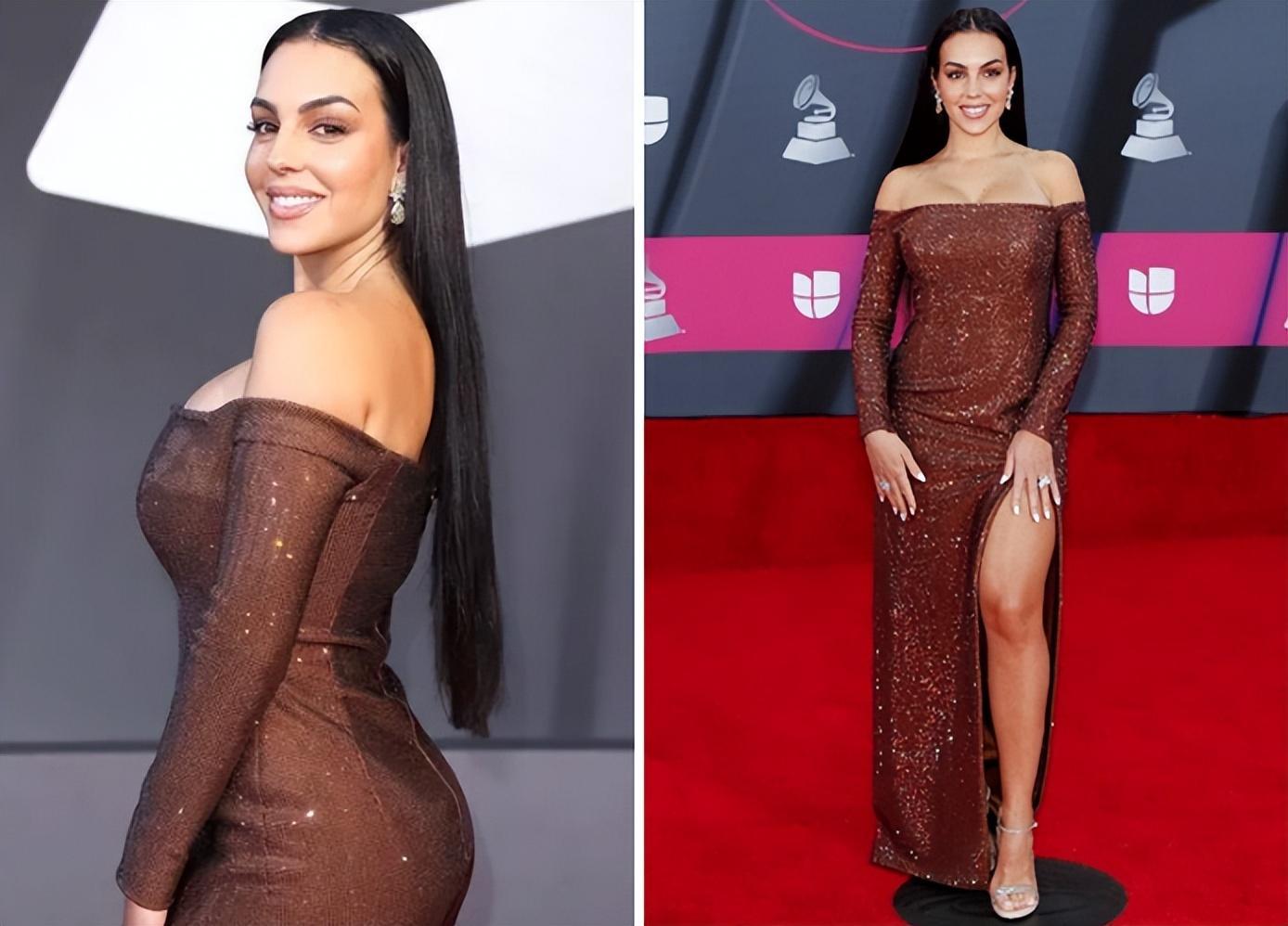 之前出席拉丁唱片學院年度人物晚會的時候,喬治娜在紅毯上身穿深V淡藍色禮服,非常搶鏡,堪稱“視覺衝擊”,而此番走上拉丁格萊美頒獎禮的紅毯,喬治娜穿着棕色的高叉晚禮裙,優雅又性感,緊緻的包裹讓她的S曲線更加突出,堪比金卡戴珊。