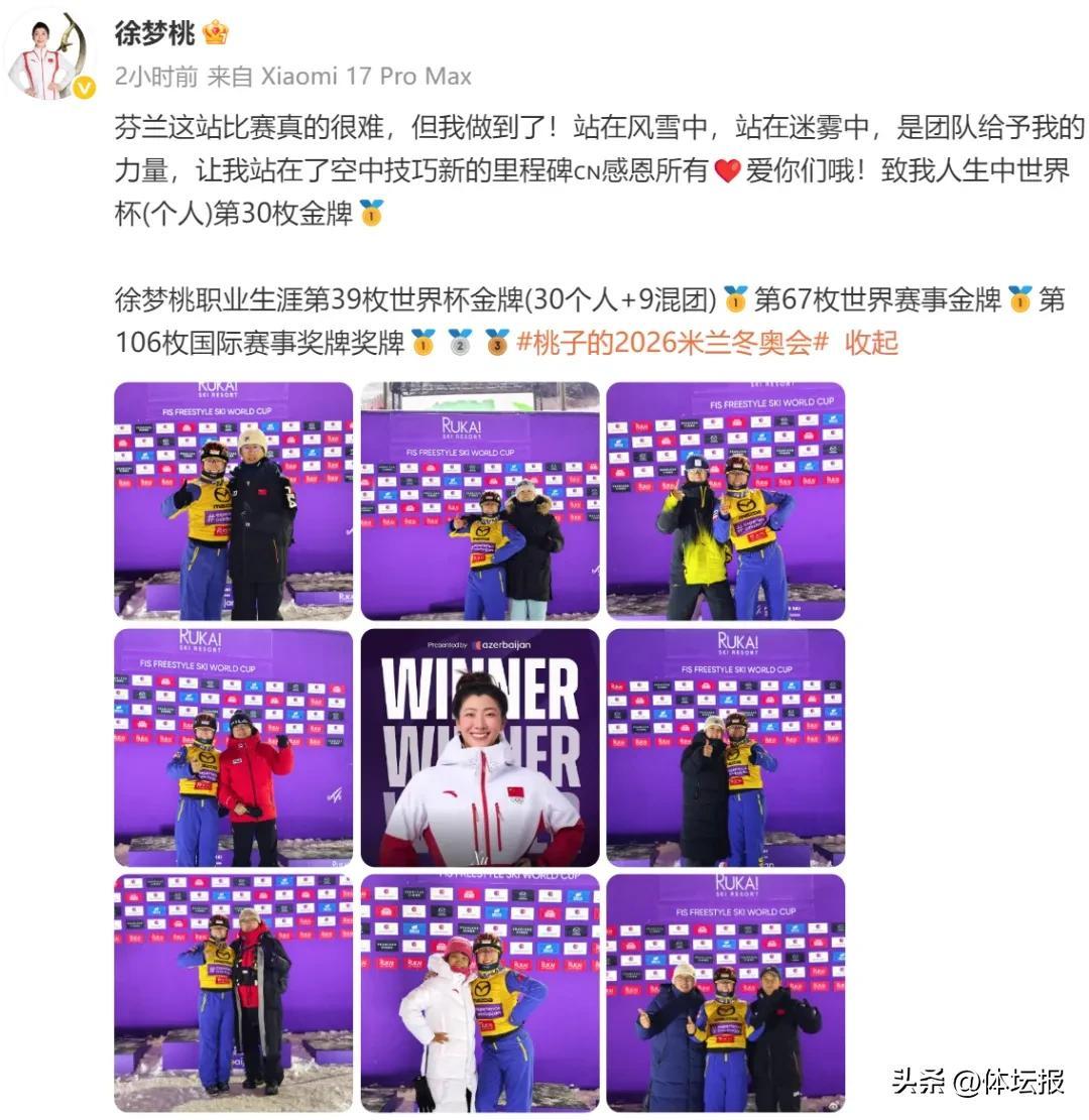 這是徐夢桃新賽季首枚世界盃金牌,也是其職業生涯第39枚世界盃金牌(30個人+9混團)。徐夢桃在本次比賽決勝輪的動作是直體後空翻三週轉體1080度,難度係數達到4.293,是六名選手中最高的。她在賽後發文表示:“芬蘭這站比賽真的很難,但我做到了!站在風雪中,站在迷霧中,是團隊給予我的力量,讓我站在了空中技巧新的里程碑。”
