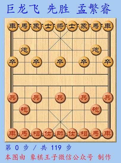 兩人首戰,巨龍飛執先手,大戰119手中盤車馬炮兵四子聯攻勝出,先下一城,拔得頭籌。