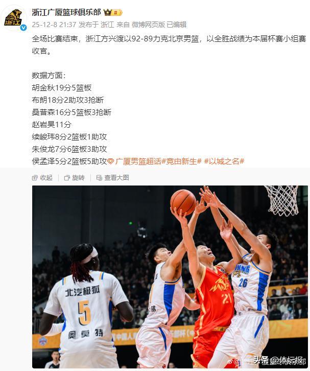 12月8日,浙江方興渡以92-89力克北京男籃,以全勝戰績爲本屆盃賽小組賽收官。(圖自@浙江廣廈籃球俱樂部)