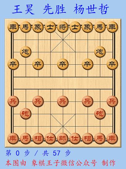 同區象甲江蘇隊猛將,實力派大師王昊與河北隊新星楊世哲激鬥55手,王昊中盤對攻,以車雙馬三兵仕相全對車雙馬炮卒士象全,拱兵喫死車勝出。