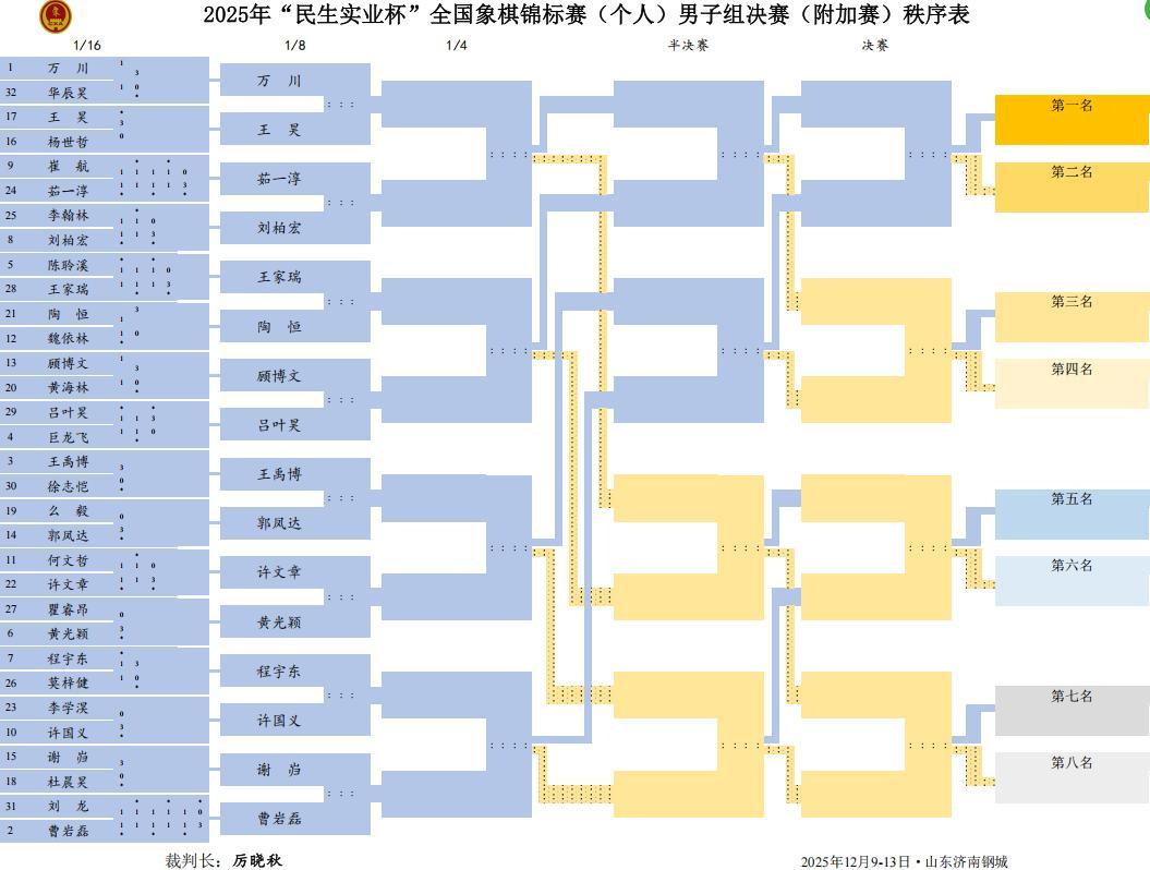 男子組32強淘汰賽猛烈對決,上半區,第一1/8分區,之前從小組中爆冷突圍的安徽05年小將萬川,與華辰昊鬥到加賽快棋,萬川勝出。