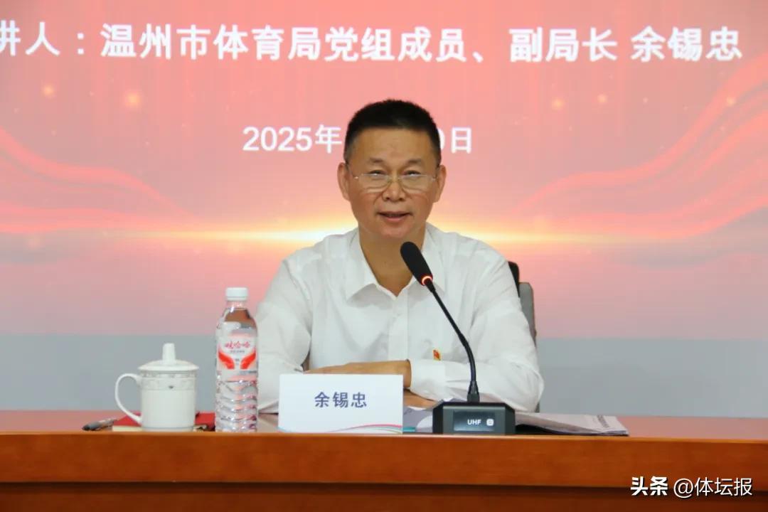 隨後,餘錫忠以《深入學習貫徹黨的二十屆四中全會精神,奮力書寫中國式現代化溫州體育新篇章》爲題講授專題黨課。他系統回顧了“十四五”時期我國經濟社會發展取得的顯著成就,並圍繞“十五五”規劃建議的主要內容進行了深入解讀。餘錫忠強調,全市體彩系統要進一步提高政治站位,增強學習貫徹黨的二十屆四中全會精神的思想自覺、政治自覺和行動自覺,切實把思想和行動統一到中央決策部署上來,凝心聚力將學習成果轉化爲推動溫州體育事業高質量發展的實際成效。