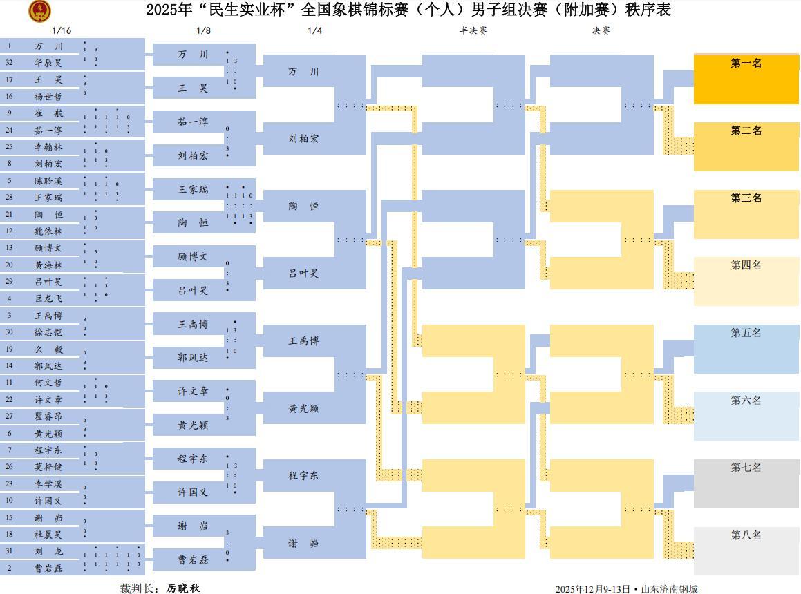 賽事男子組八強戰,上半區劉柏宏對萬川,呂葉昊VS陶恆,下半區王禹博對黃光穎,程宇東VS謝巋。