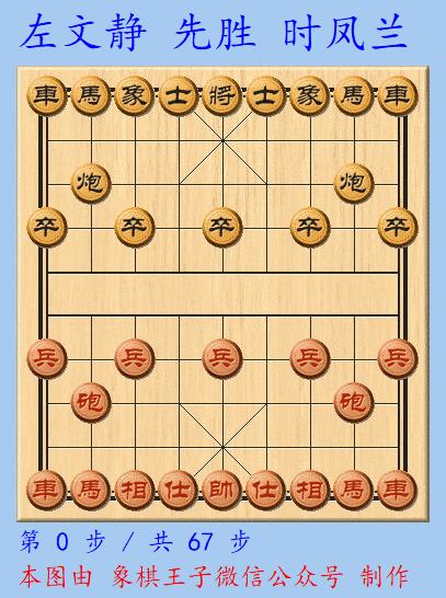 象棋女神時鳳蘭與左盟主左文靜在慢棋戰平後,較量快棋,此仗,左文靜執先手,使出拿手的飛相陣,時鳳蘭應以左中炮。