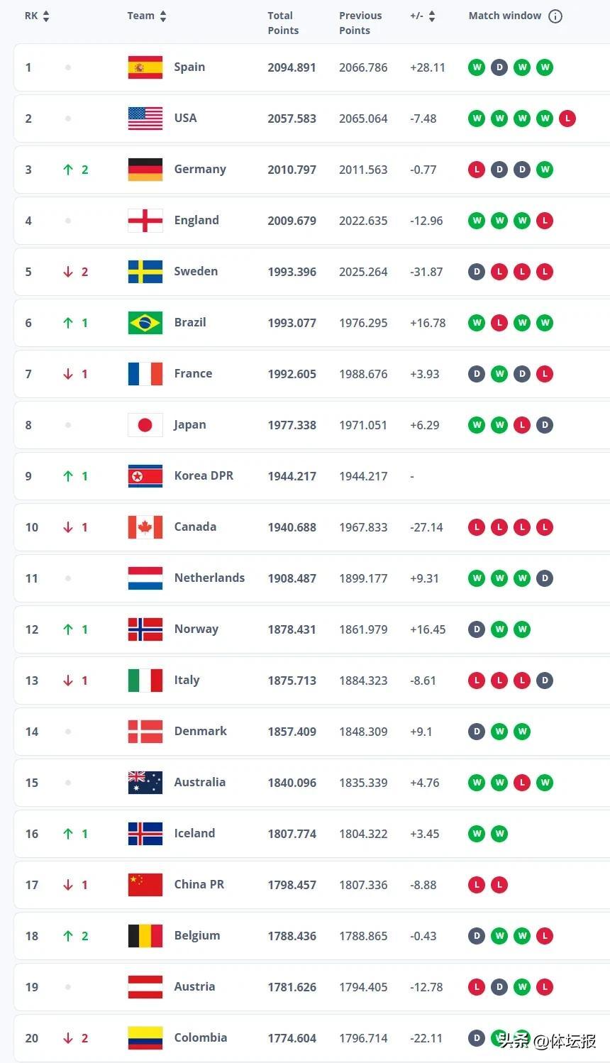 近期,中國女足進行了兩場比賽,分別0-8慘敗英格蘭,2-3輸給蘇格蘭。因此,中國女足的積分相較上期減少8.88分,以1798.457分排名第17位。而此前落後中國女足的冰島女足面對北愛爾蘭隊獲得兩連勝,從而超越中國女足升至第16位。