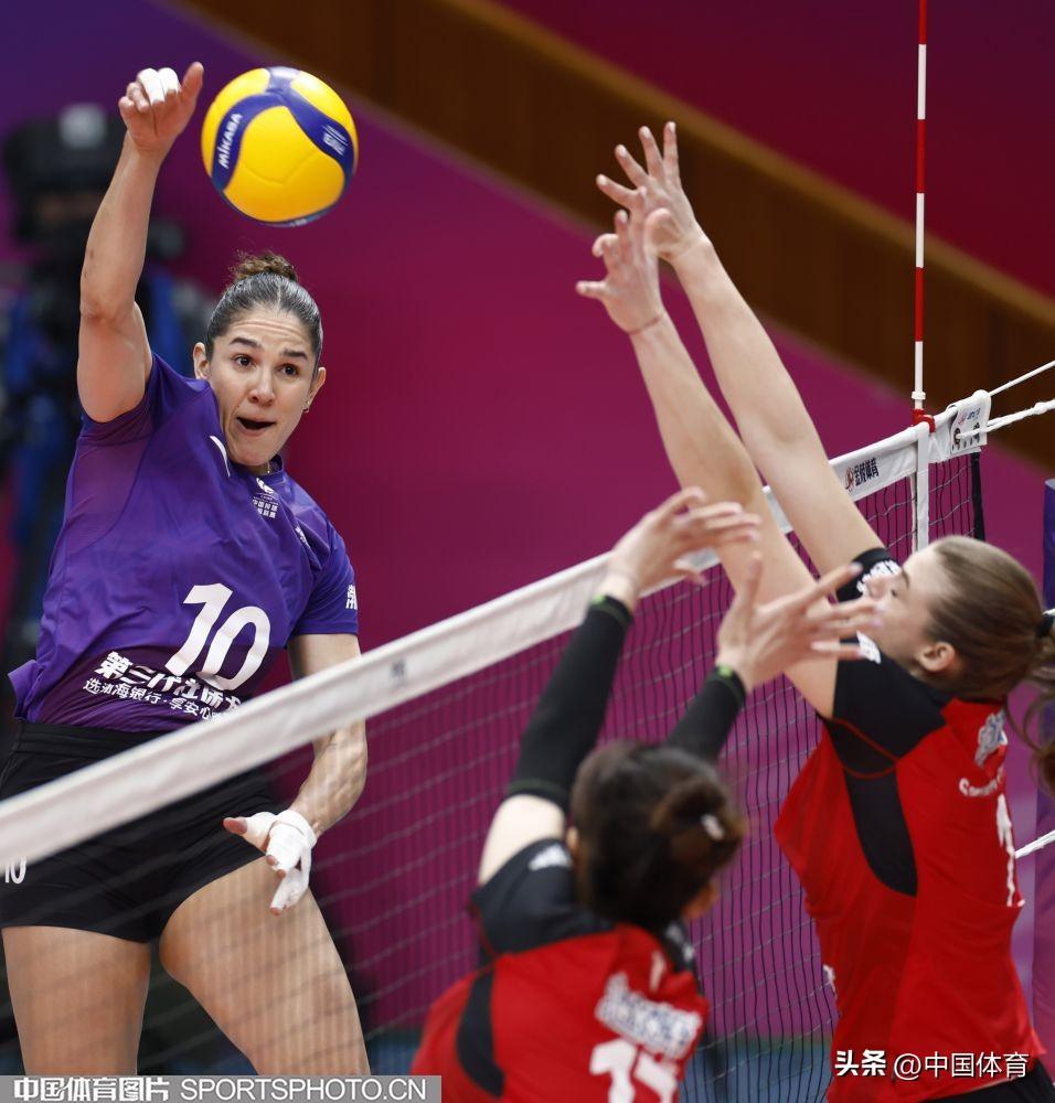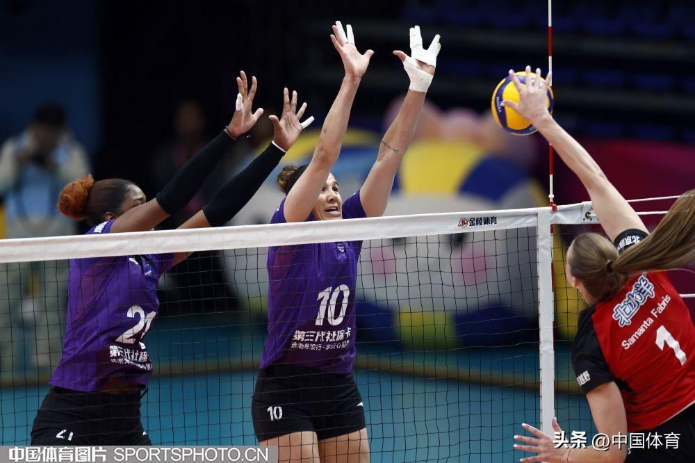 天津渤海銀行隊娜塔莉亞·齊利奧·佩雷拉和金內裏·馬丁內斯(左)雙人攔網