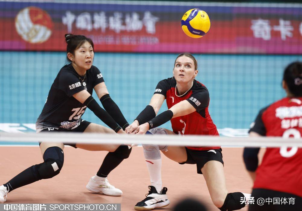 北京北冰洋隊埃迪娜·貝吉奇和自由人劉天(左)防守
