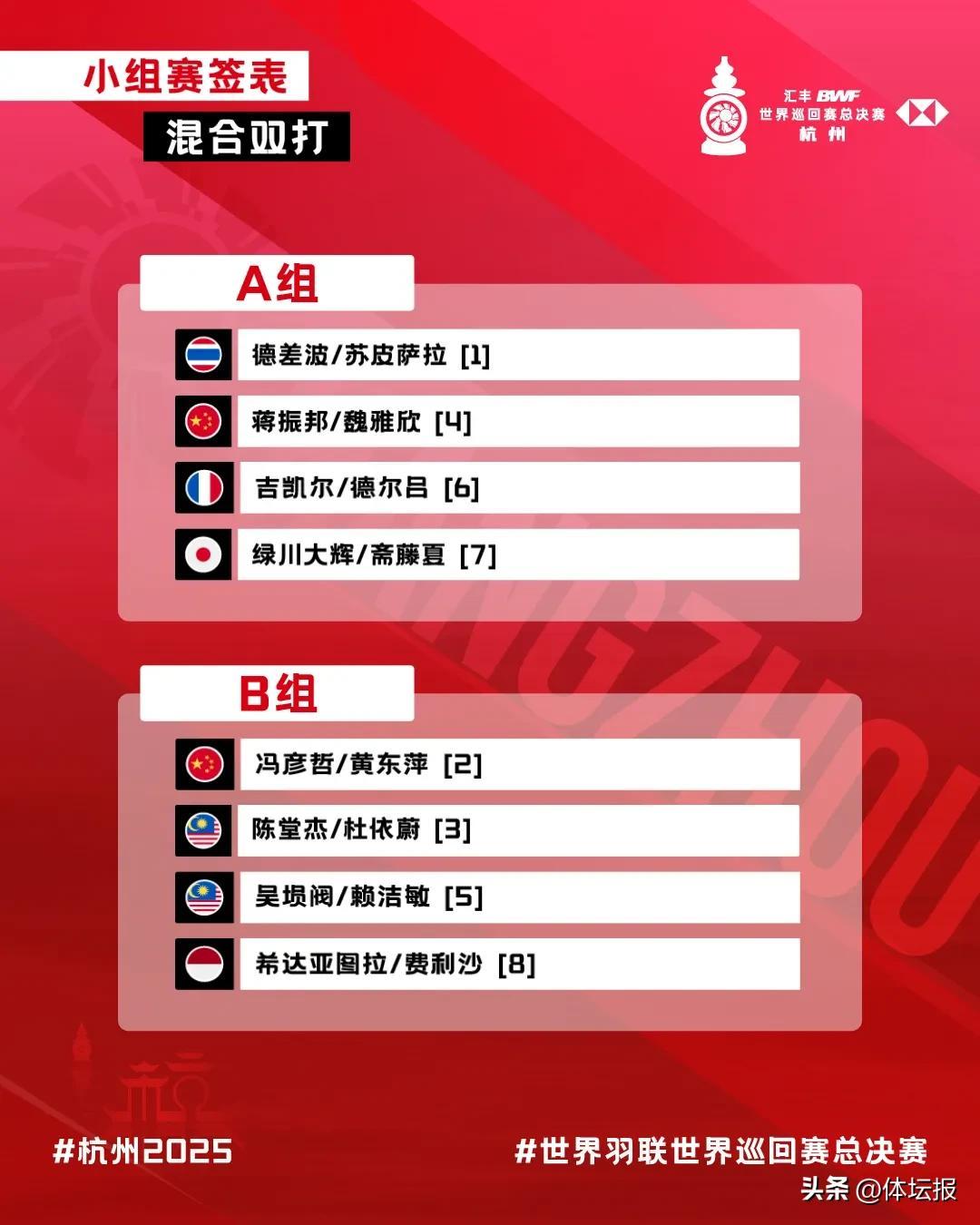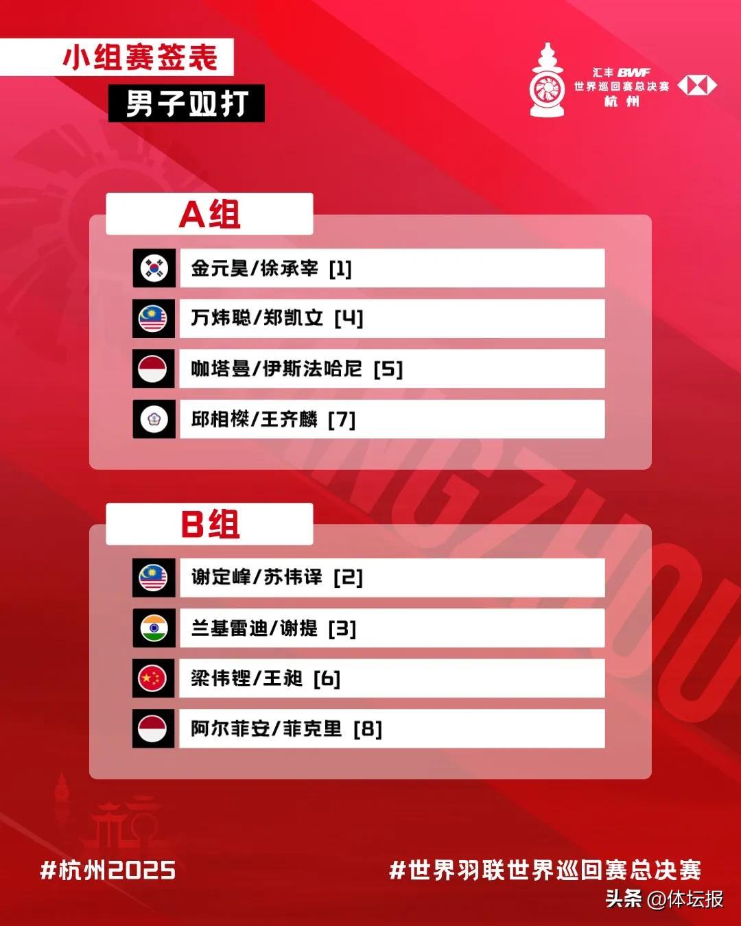 12月13日,2025年世界羽聯世界巡迴賽總決賽抽籤儀式在杭州舉行,各項目抽籤結果出爐,備受關注的浙江選手王昶與搭檔梁偉鏗組成的“梁王”組合與實力強勁的馬來西亞組合謝定峯/蘇偉譯、印度組合蘭基雷迪/謝提、印尼組合阿爾菲安/菲克里同組,堪稱強敵環伺。