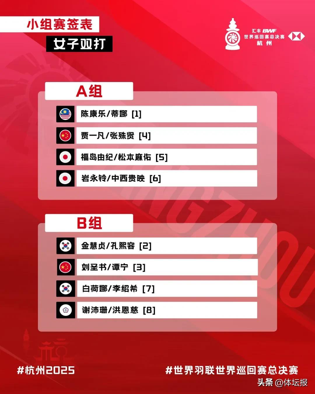 女雙方面,中國組合賈一凡/張殊賢分在A組,同組還有馬來西亞組合陳康樂/蒂娜、日本組合福島由紀/松本麻佑和另一對日本組合巖永鈴/中西貴映。中國“聖壇”組合劉聖書/譚寧則將在B組與韓國組合金慧貞/孔熙容、另一對韓國組合白荷娜/李紹希和中國臺北組合謝沛珊/洪恩慈展開對決。