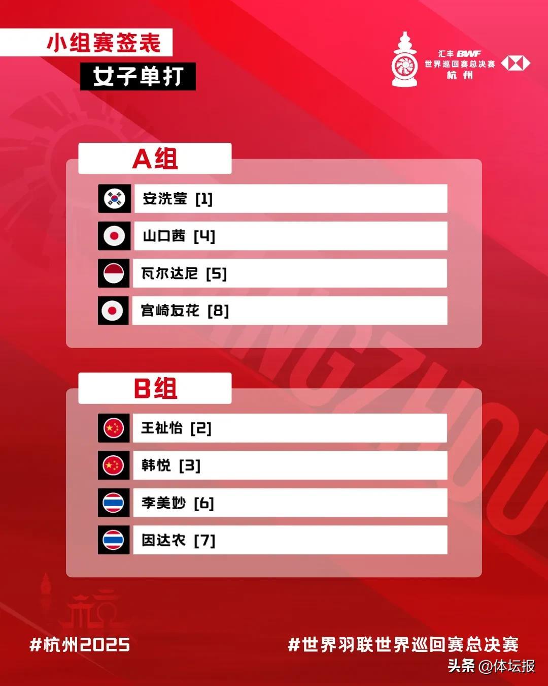 世界羽聯世界巡迴賽總決賽是世界羽壇的年度收官之戰,匯聚全球頂尖羽毛球選手,角逐男單、女單、男雙、女雙和混雙五個項目的年度總冠軍。按照賽事規則,5個單項各有8個參賽席位,根據全年的世界巡迴賽積分榜各單項前八名來初步分配參賽名額。國羽在其中4個單項都獲得滿額參賽席位。男單出戰選手爲石宇奇、李詩灃,女單爲王祉怡、韓悅。男雙由“梁王”出戰,女雙的出戰選手分別爲劉聖書/譚寧、賈一凡/張殊賢,混雙則是由“鳳凰”組合馮彥哲/黃東萍、蔣振邦/魏雅欣出戰。