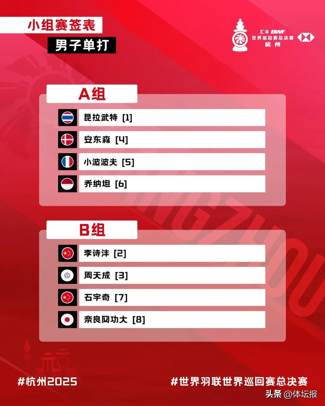 男單方面,兩名中國選手李詩灃和石宇奇均被分到B組,同組的還有中國臺北選手周天成和日本選手奈良岡功大。泰國選手昆拉武特、丹麥選手安東森、法國選手小波波夫和印尼選手喬納坦被分到A組。
