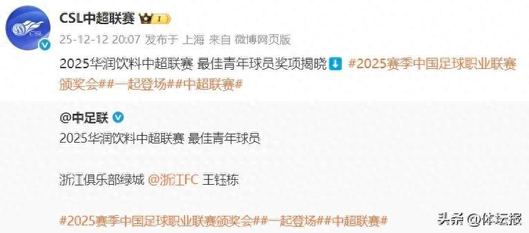 12月12日,2025賽季中國足球職業聯賽頒獎典禮在上海舉行,浙江職業足球俱樂部小將王鈺棟榮獲年度最佳青年球員,外援米特里策入選中超最佳陣容。