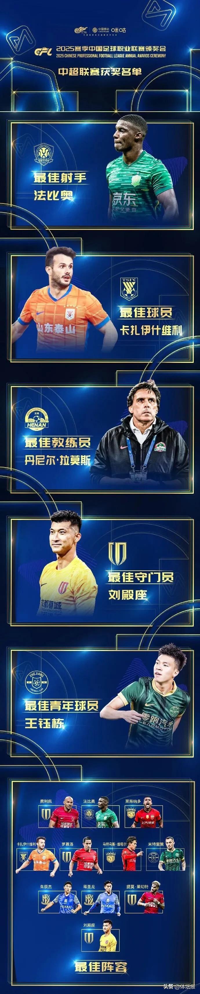 其他獎項方面,山東泰山外援卡扎伊什維利當選中超年度最佳球員,河南隊主教練拉莫斯當選年度最佳主帥,成都蓉城守門員劉殿座當選最佳守門員,最佳射手歸屬北京國安外援法比奧(28球)。
