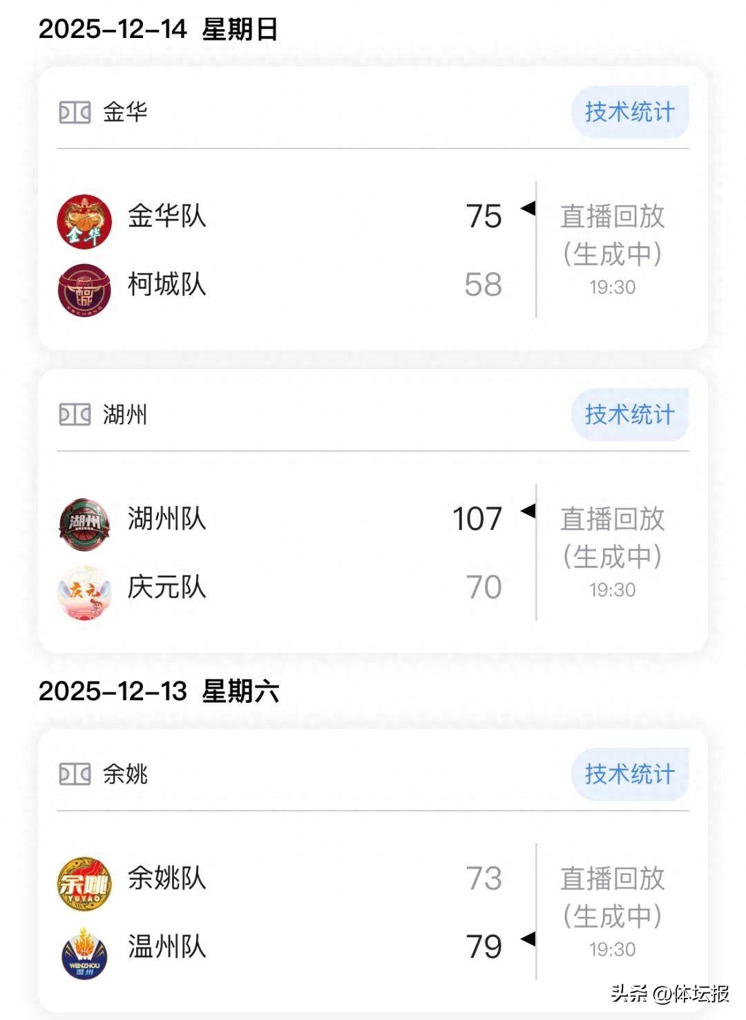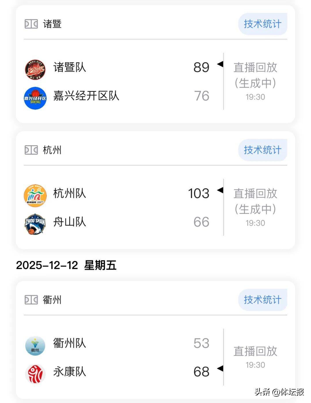 上週(12月8日-12月14日),浙BA城市爭霸賽第十八輪共進行了10場對決。比賽結果如下: