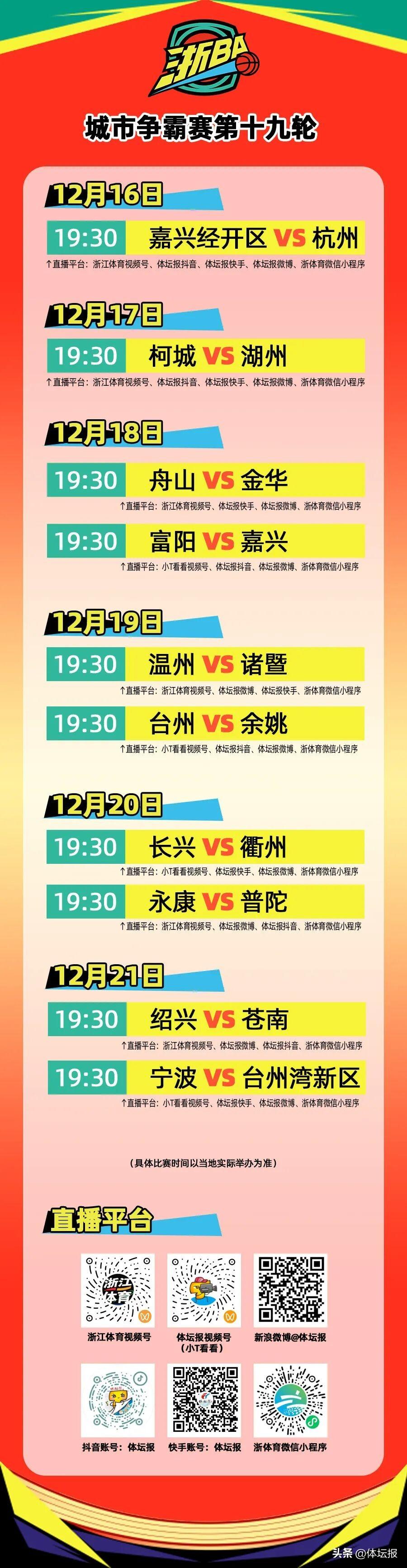 最後四輪激戰在即,本週(12月15日-12月21日),浙BA城市爭霸賽將進行第十九輪的對決。本週賽程如下↓