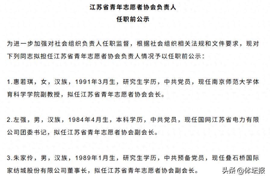 近日,江蘇省青年志願者協會發布負責人任前公示。其中包括:惠若琪,女,漢族,1991年3月生,研究生學歷,中共黨員,現任南京師範大學體育科學學院副教授,擬任江蘇省青年志願者協會會長。