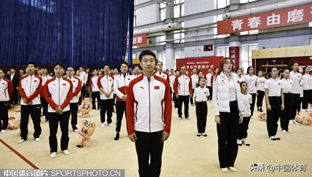 國家體育總局體操中心主任常成(右二)、國家體育總局體操運動管理中心副主任袁守龍(左二)爲冠軍揭榜