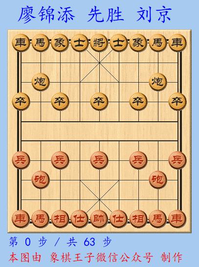 雙方以仙人指路對挺卒,紅轉左中炮陣,演繹猛烈的對攻,廖錦添目光敏銳,紅棋在左翼的纏鬥中,抓住機會,以雙車搶馬之力,一舉多子。