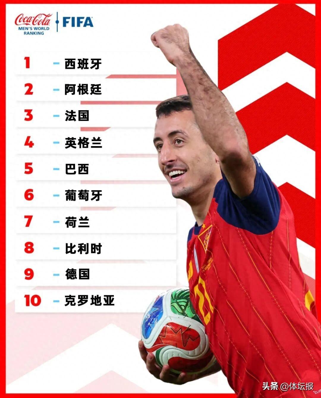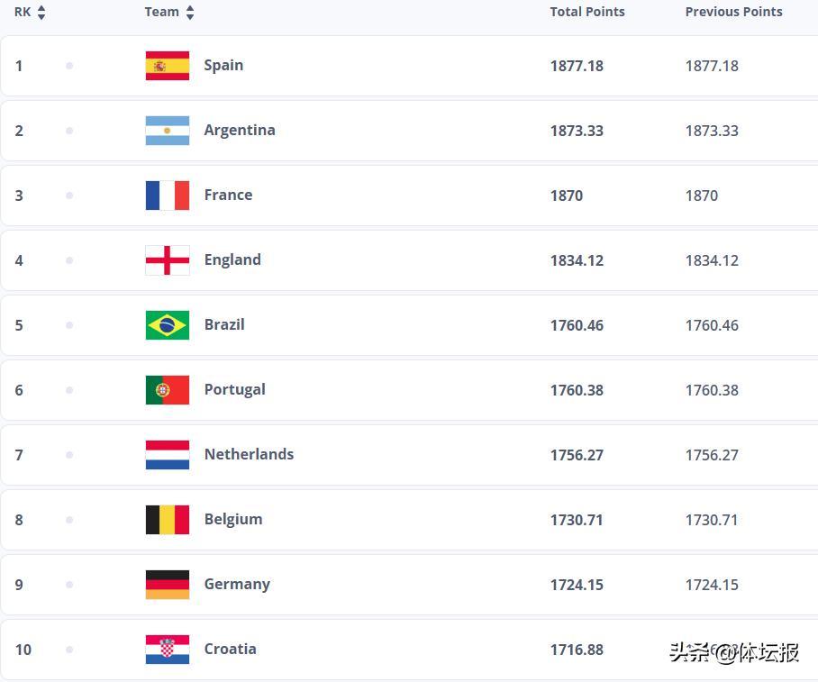 12月22日,FIFA官方公佈2025年終男足世界排名。西班牙排名世界第一,阿根廷第二,法國第三。