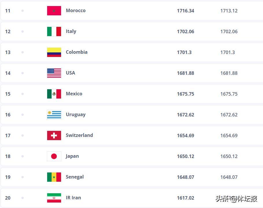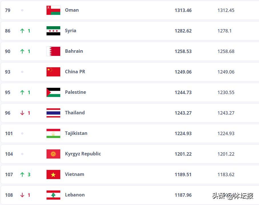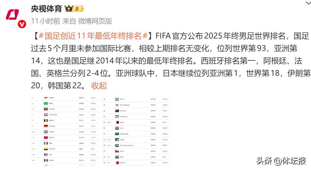 國足過去5個月裏未參加國際比賽,相較上期排名無變化,位列世界第93,亞洲第14,這也是國足繼2014年以來的最低年終排名。亞洲區球隊中,日本繼續位列亞洲第1,世界第18;伊朗亞洲第2,世界第20;韓國亞洲第3,世界第22。
