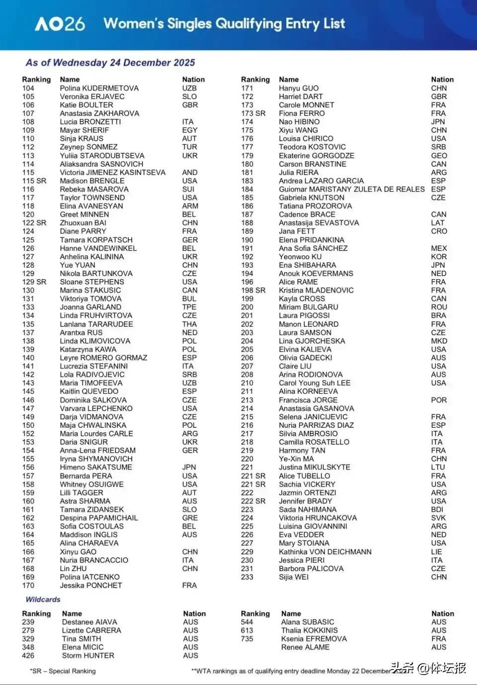 在此前公佈的澳網正賽名單中,男單方面,商竣程、張之臻憑藉保護排名入圍,浙江選手布雲朝克特持外卡入圍。女單方面,鄭欽文、王欣瑜、張帥憑藉排名入圍,王雅繁採用保護排名。