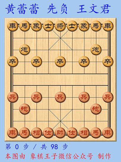 這日同女子大師黃蕾蕾的一戰,王文君執黑棋戰入馬炮雙卒士象全對雙炮兵仕相全,馬後炮叫殺中,98手強力致勝,昂首晉級。