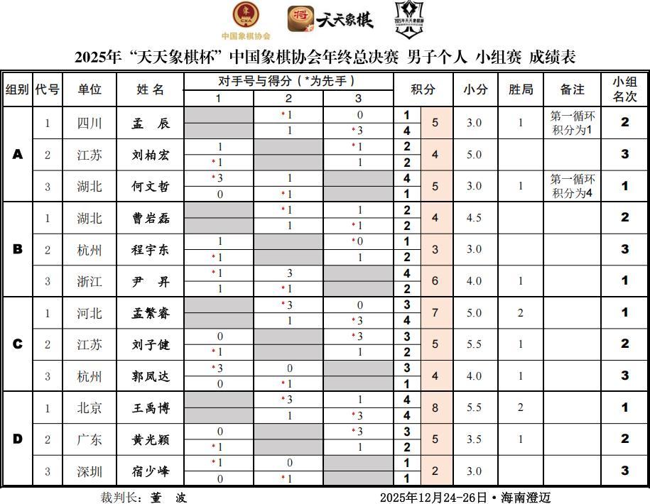 第三小組,四號種子、小魔童,新升特大孟繁睿7分第一,組內兩位大師,五羊杯季軍劉子健5分第二,郭鳳達4分第三。