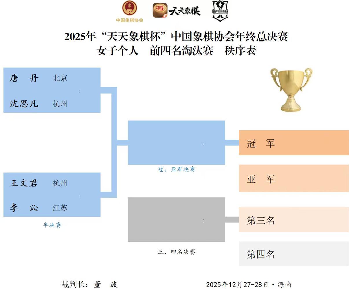 大賽27日上午九點半、下午一點、晚上七點,進行本次大戰男女四強半決賽的超級大斗,以及季軍戰的連場比拼,誰能一舉勝出,強勢挺進冠軍總決賽,直衝王冠巔峯和金盃大獎,象棋王子也將繼續進行全程的直播和報道(抖音:象棋王子),敬請關注、支持、守護,謝謝!