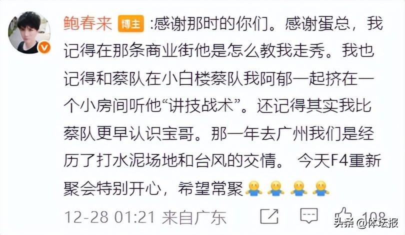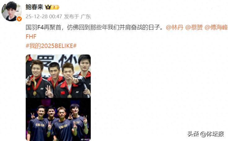 12與28日凌晨,知名羽毛球運動員鮑春來通過微博發佈了和林丹、蔡贇、傅海峯的合照,並配文“國羽F4再聚首,彷彿回到那些年我們並肩奮戰的日子”。