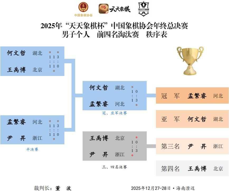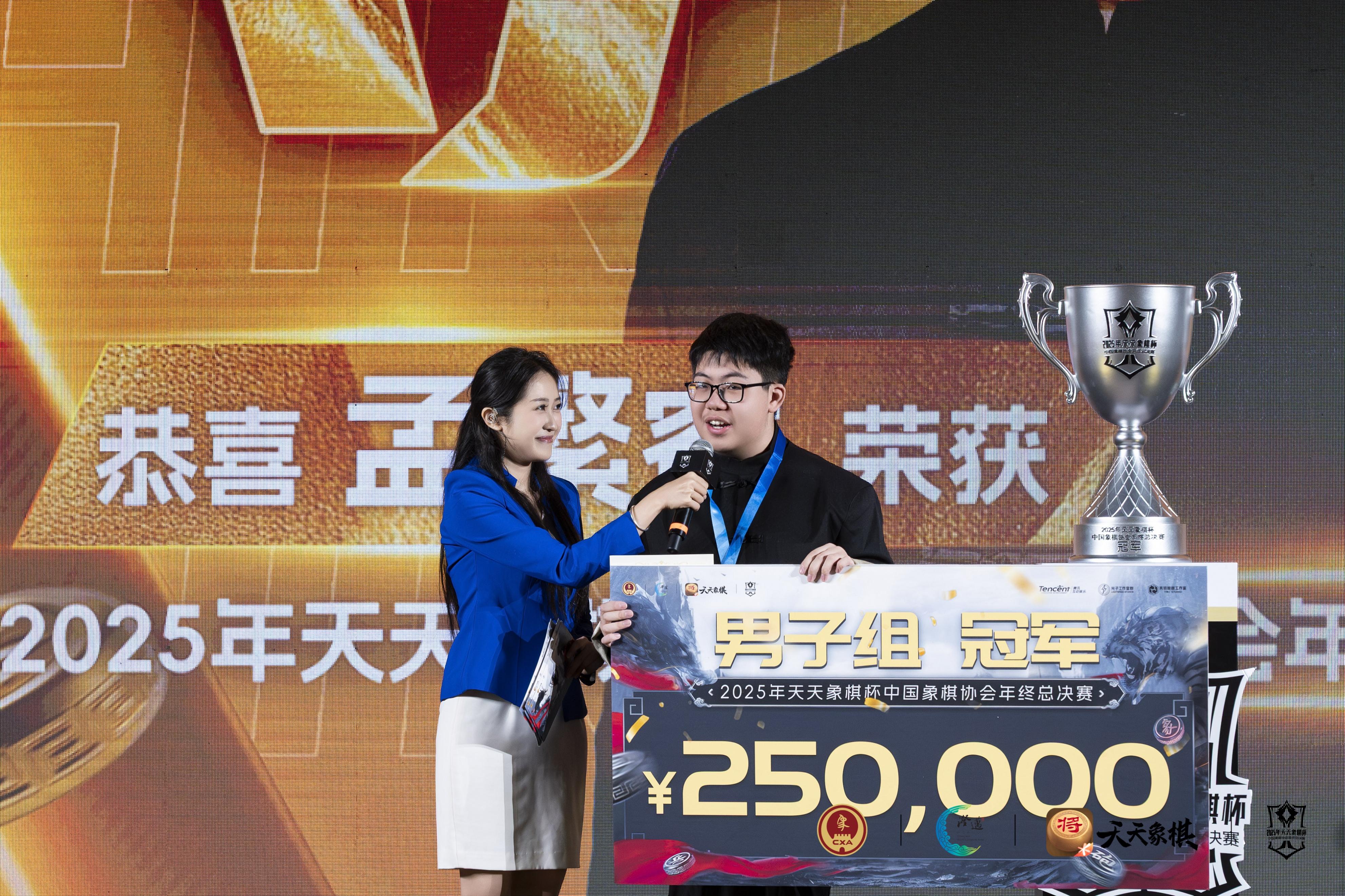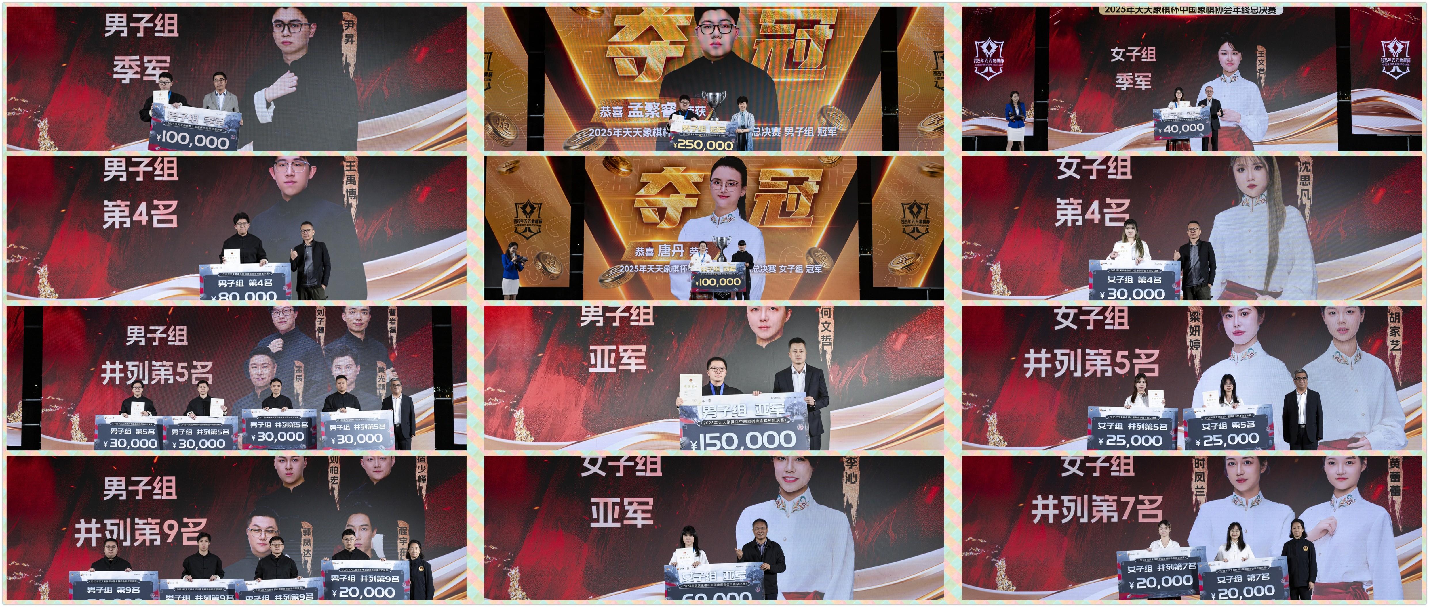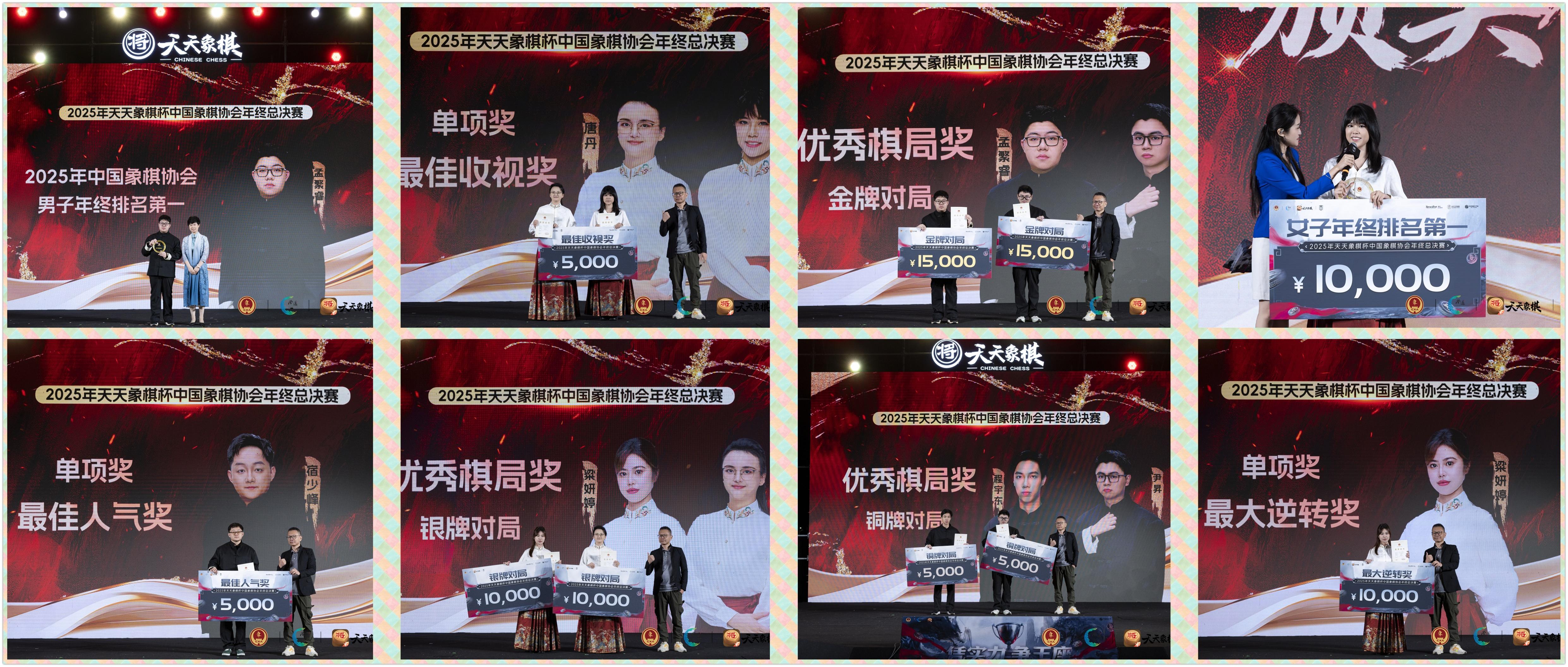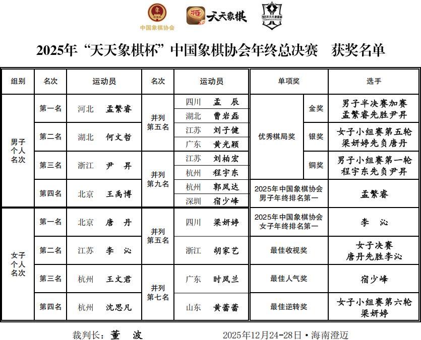 熱烈祝賀2025年“天天象棋杯”中國象棋協會年終總決賽在海南澄邁獲得圓滿成功,恭賀08年小魔童、新晉特大孟繁睿勇奪總冠軍,豪取超級大冠,賽季第三金和27萬大獎,在十八歲成年禮前實現重大騰躍和昇華,賀喜女子象棋歷史第一人、十冠王、超級丹唐丹傲視女子王座,勇獲賽季第六大冠,首獲積分冠軍和11.25萬大獎,最佳收視獎,映襯一姐之赫赫聲威,恭祝優秀獲獎選手,爲大賽和棋手鼓掌,點贊,喝彩。