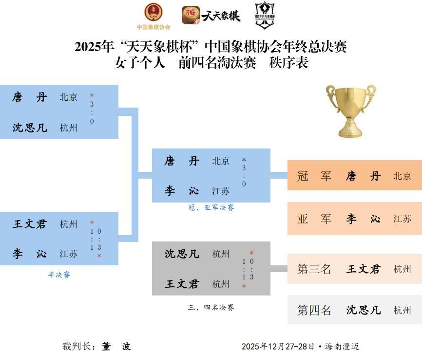 女子季軍戰,棋後賽桂冠、03年天才少女王文君勝出,獲獎四萬,個人賽亞軍沈思凡第四,獎勵三萬。