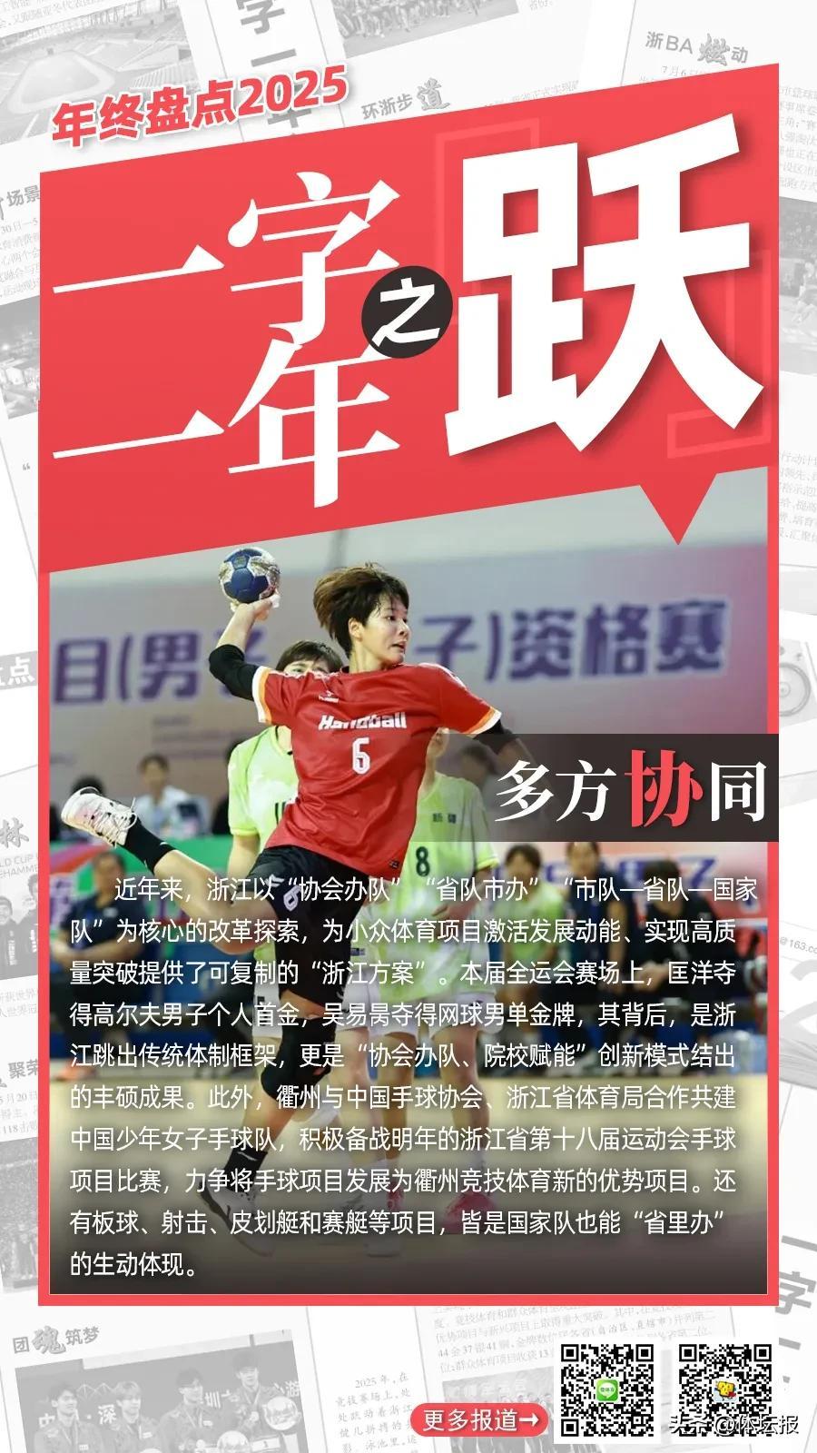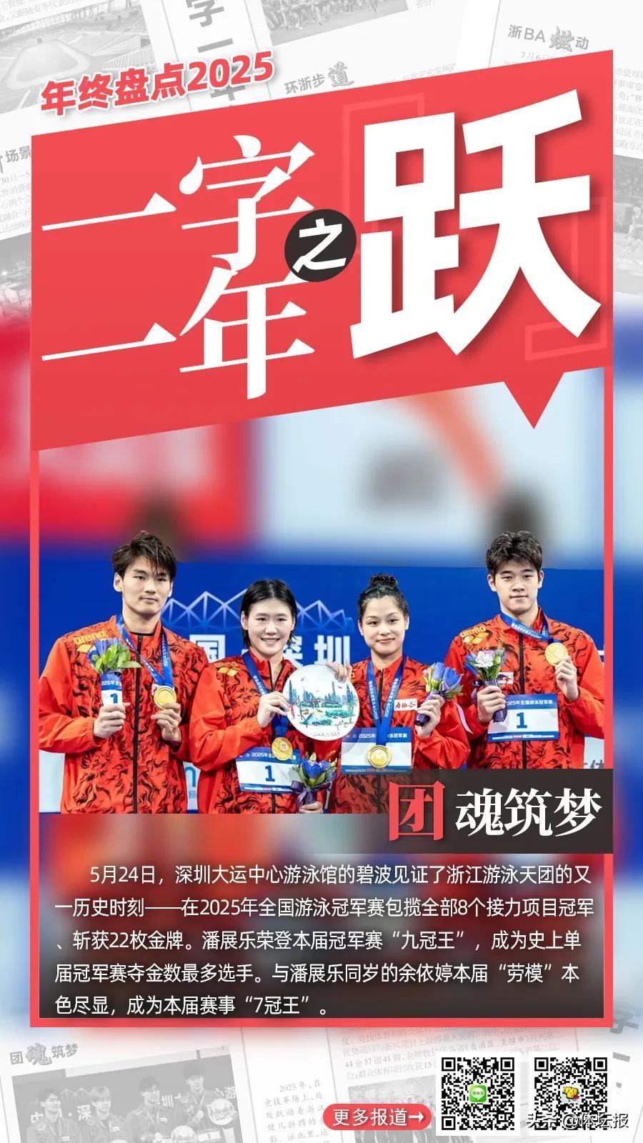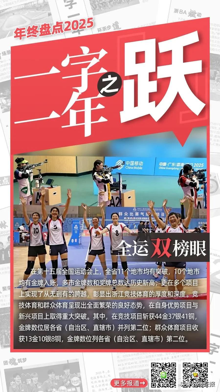 2025年,在競技賽場上,處處躍動着浙江健兒拼搏的身影。泳池裏,運動員們躍入碧波,浪花翻湧間劃開速度的賽道;田徑場上,健兒們助跑、騰躍,每一次縱身都向着更高的紀錄衝擊;籃筐之下,籃球運動員驟然躍起,在空中舒展身體振臂投籃,將球奮力投向目標......躍,是訓練館裏無數次蓄力後的迸發,是賽場上超越對手更超越自我的果敢,更是浙江競技體育踏浪前行、不斷攀高的鏗鏘步伐,躍動出屬於這片熱土的體育榮光。體壇報綜合報道製圖:華雨晨(體壇報)