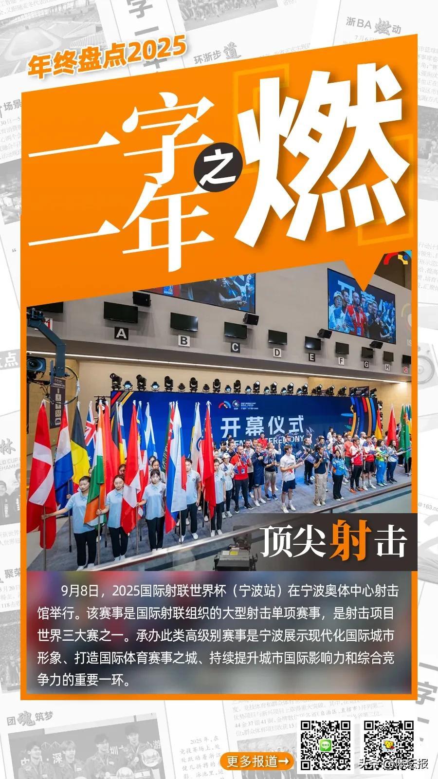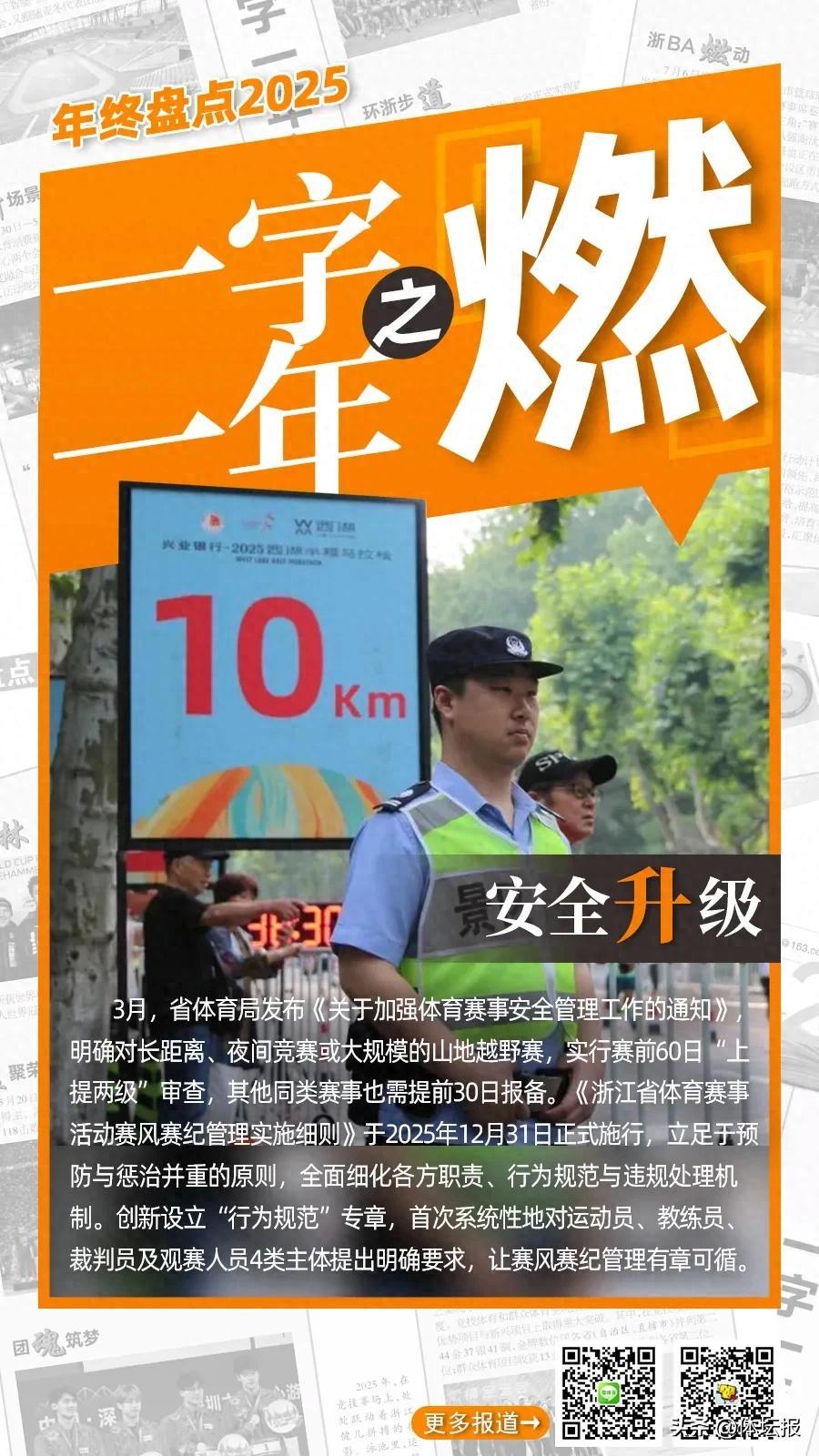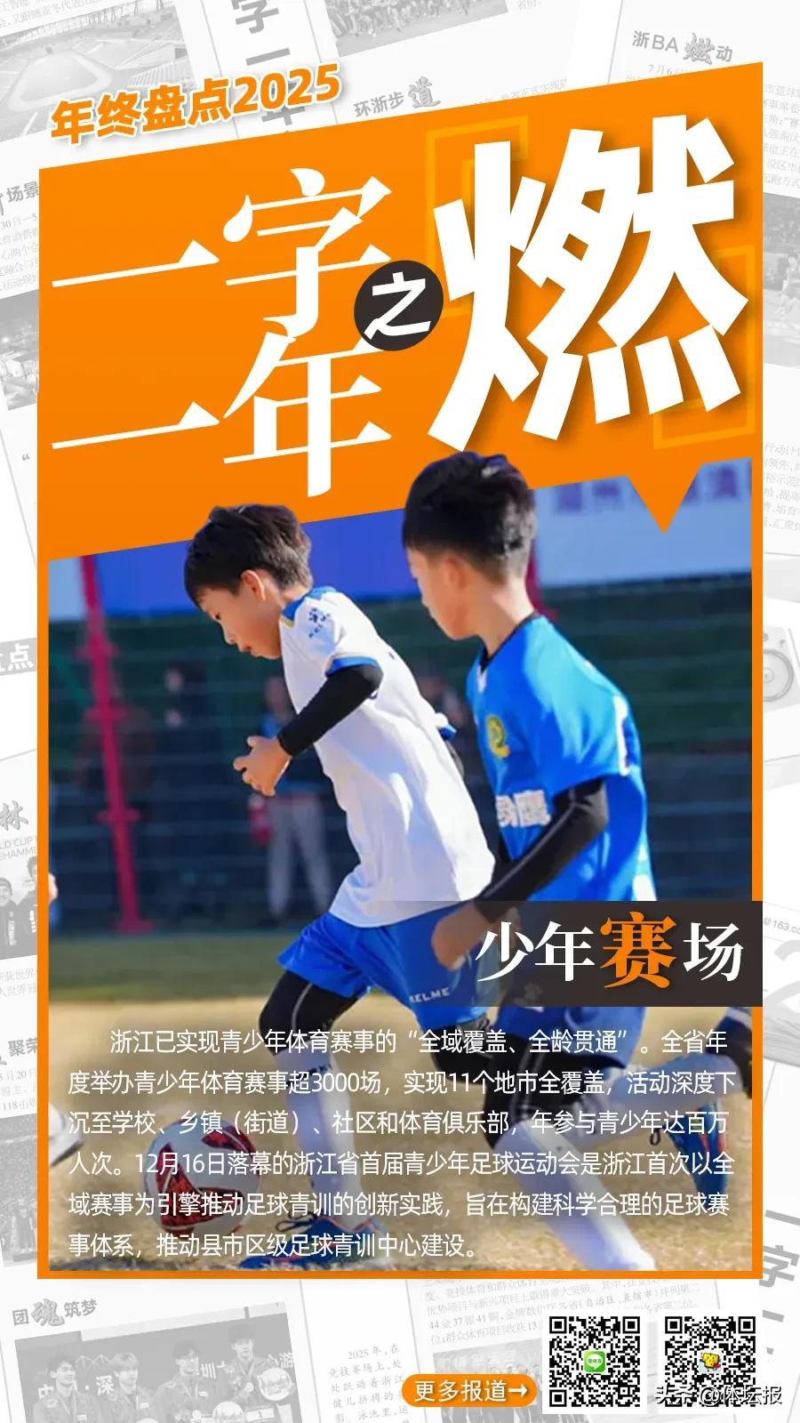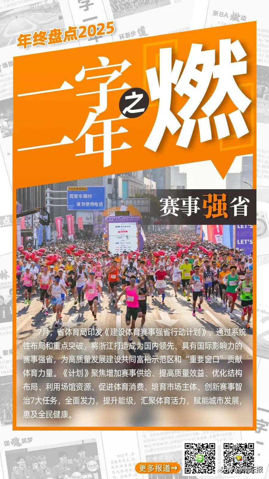 燃——賽事盛火點燃全民激情,釋放體育灼灼熱能。賽事升級、國際接軌,頂級賽會爭相落地;政策夯基、規則護航,強省藍圖系統鋪展;全民燃動、草根登場,體育活力深度賦能——2025年的浙江體育,正匯聚成一股賽事能級躍升、體系構建完善、全民參與湧動的磅礴之勢。製圖:華雨晨(體壇報)