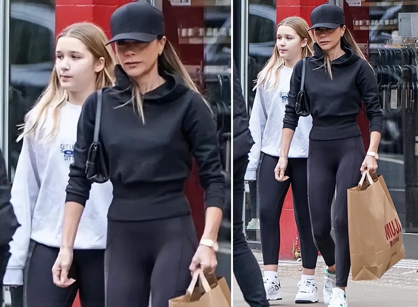 貝克漢姆的妻子維多利亞帶着11歲小女兒哈珀出街購物,只見,貝嫂一身黑衣搭配緊身瑜伽褲,休閒運動打扮,基本上沒有化妝,戴着鴨舌帽遮掩,屬於是素顏外出。而身邊的女兒小七,和媽媽一樣都穿瑜伽褲,不過她倒是大大方方地走在路上,金髮飄逸,非常可愛。