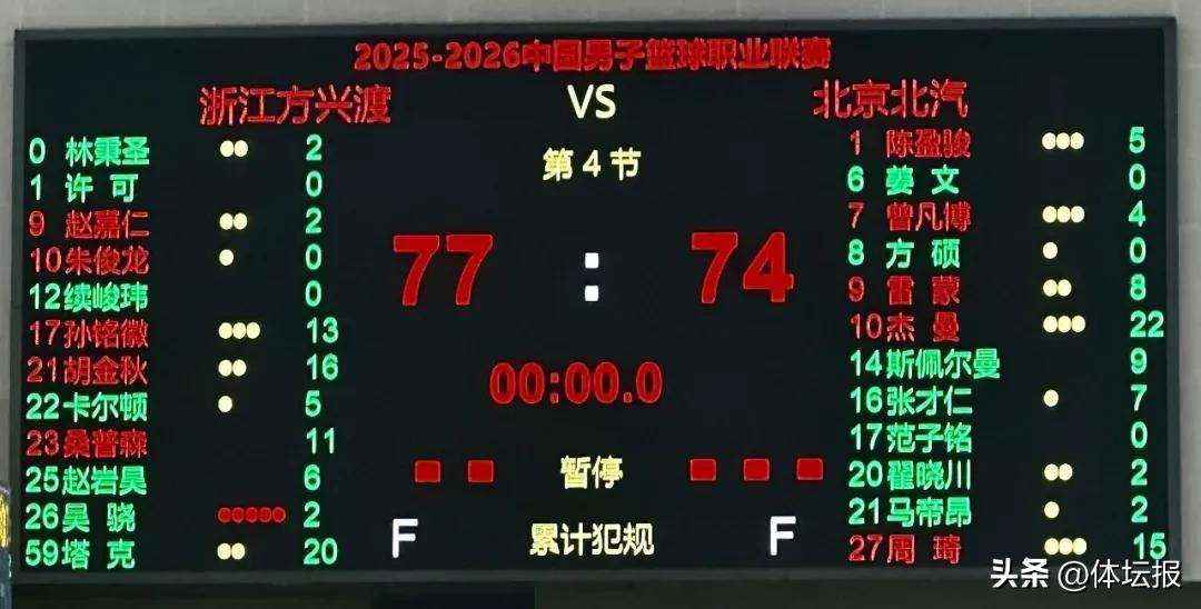 1月3日晚,浙江方興渡迎來2026年主場第一戰,對手是北京北汽。這已是兩隊本賽季第二次相遇,首回合交鋒,客場作戰的方興渡力克對手。這次,獲勝的仍舊是方興渡,球隊以77:74戰勝北京,拿下新年主場首勝。