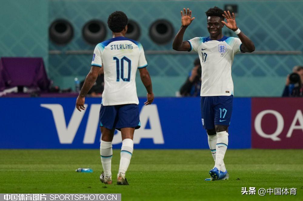 圖爲英格蘭隊斯特林與薩卡(右)慶祝進球