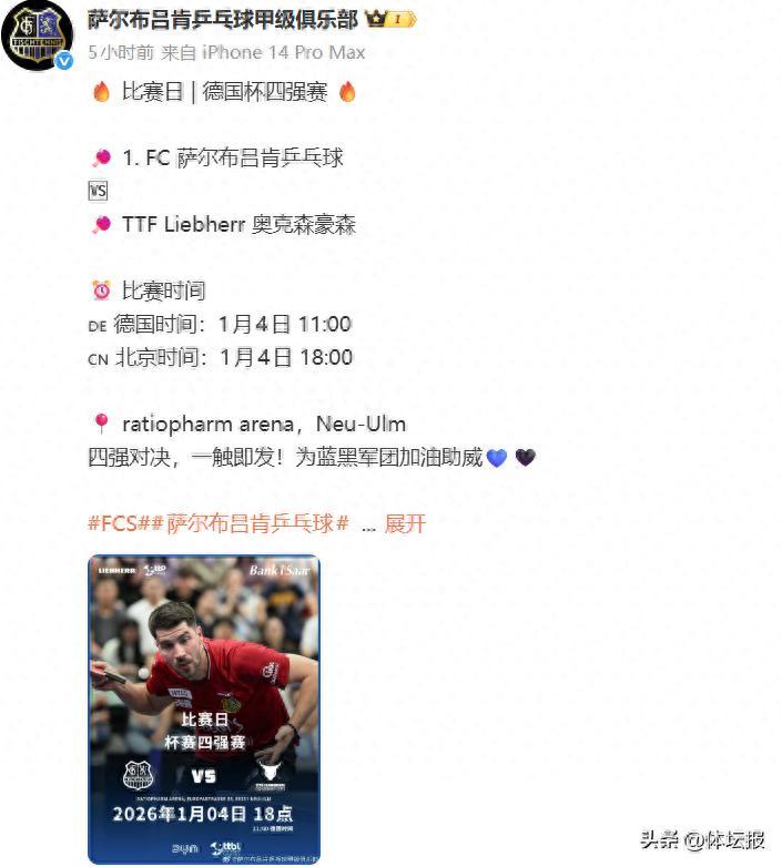 北京時間1月4日18:00,乒乓球德國杯半決賽開賽,中國名將樊振東將迎來2026賽季首秀,他將率領薩爾布呂肯隊,挑戰衛冕冠軍奧克森豪森隊。決賽將於同日晚間預計21:00後打響,若隊伍順利晉級,樊振東也將衝擊留洋生涯首冠!