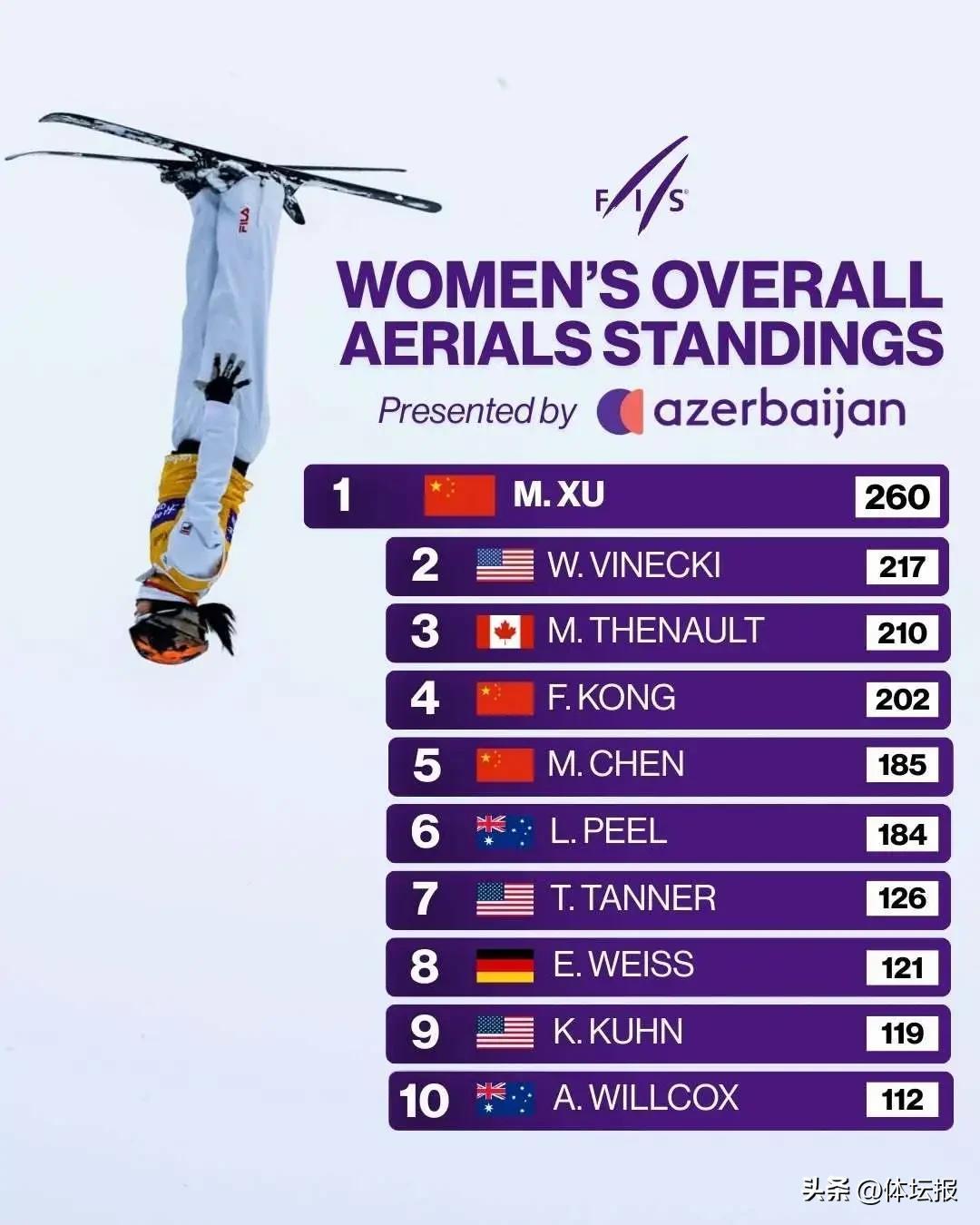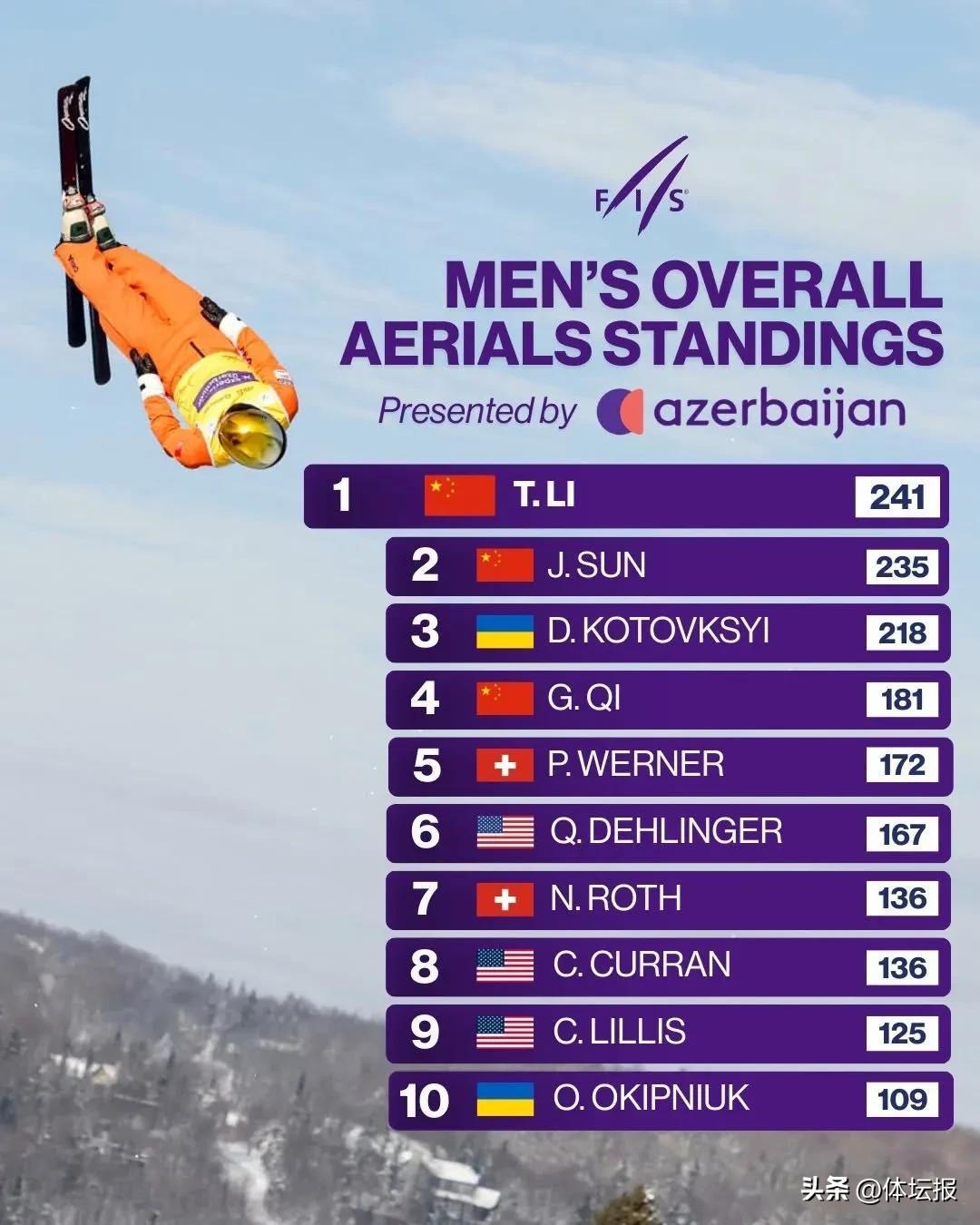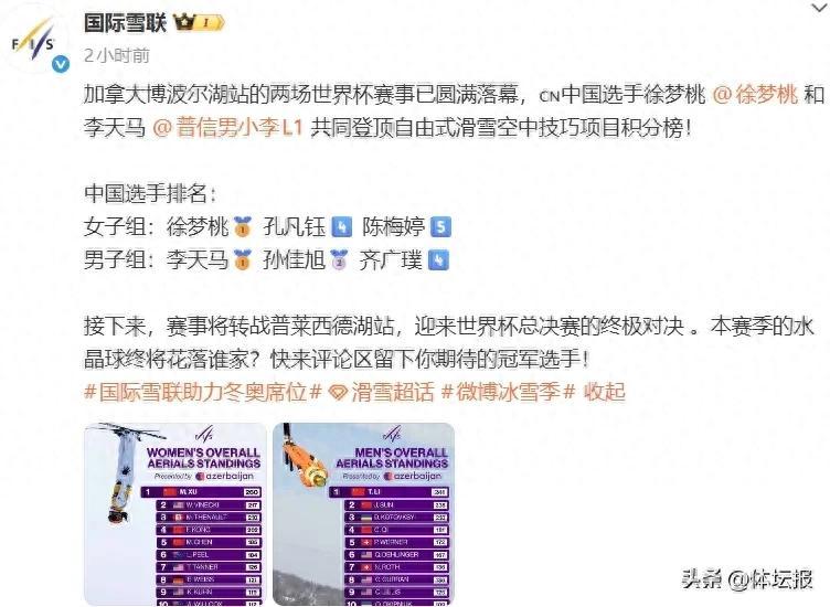隨着2025—2026賽季自由式滑雪空中技巧世界盃加拿大博波爾湖站昨日收官,最新積分榜今天出爐。中國選手徐夢桃、李天馬雙雙登頂該項目積分榜!
